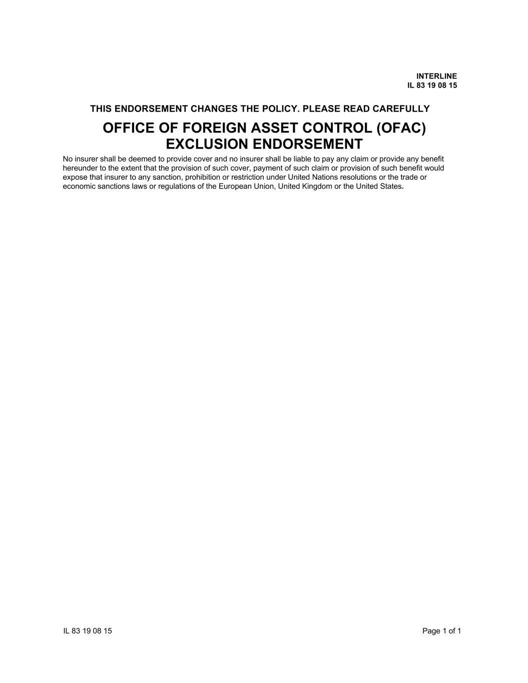 INTERLINE IL 83 19 08 15 THIS ENDORSEMENT CHANGES THE POLICY. PLEASE READ CAREFULLY OFFICE OF FOREIGN ASSET CONTROL (OFAC) EXCLUSION ENDORSEMENT No insurer shall be deemed to provide cover and no insurer shall be liable to pay any claim or provide any benefit hereunder to the extent that the provision of such cover, payment of such claim or provision of such benefit would expose that insurer to any sanction, prohibition or restriction under United Nations resolutions or the trade or economic sanctions laws or regulations of the European Union, United Kingdom or the United States. IL 83 19 08 15 Page 1 of 1