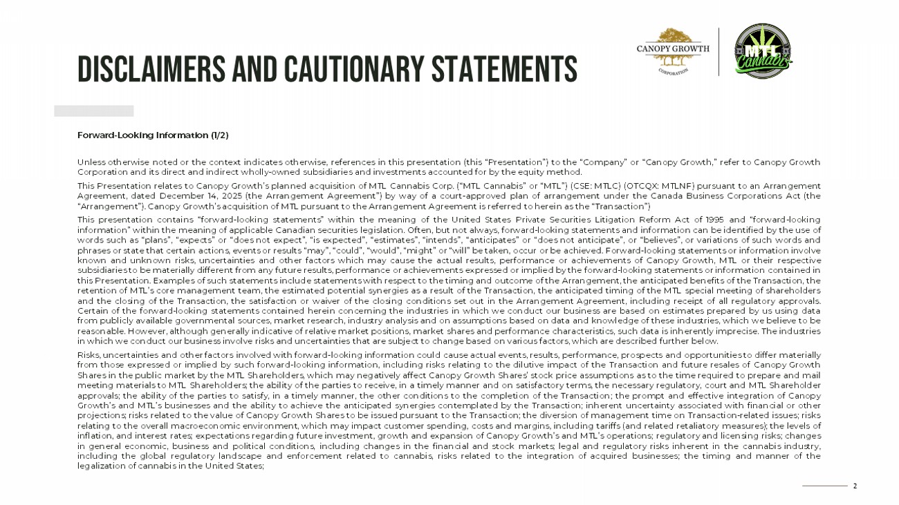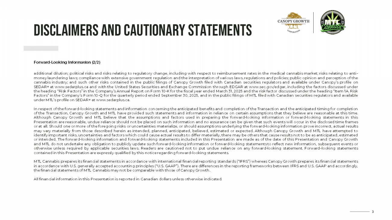 2 DISCLAIMERS AND CAUTIONARY STATEMENTS Forward - Looking Information (1/2) Unless otherwise noted or the context indicates otherwise, references in this presentation (this “Presentation”) to the “Company” or “Canopy Growth,” refer to Canopy Growth Corporation and its direct and indirect wholly - owned subsidiaries and investments accounted for by the equity method . This Presentation relates to Canopy Growth’s planned acquisition of MTL Cannabis Corp . (“MTL Cannabis” or “MTL”) (CSE : MTLC) (OTCQX : MTLNF) pursuant to an Arrangement Agreement, dated December 14 , 2025 (the Arrangement Agreement”) by way of a court - approved plan of arrangement under the Canada Business Corporations Act (the “Arrangement”) . Canopy Growth’s acquisition of MTL pursuant to the Arrangement Agreement is referred to herein as the “Transaction”) This presentation contains “forward - looking statements” within the meaning of the United States Private Securities Litigation Reform Act of 1995 and “forward - looking information” within the meaning of applicable Canadian securities legislation . Often, but not always, forward - looking statements and information can be identified by the use of words such as “plans”, “expects” or “does not expect”, “is expected”, “estimates”, “intends”, “anticipates” or “does not anticipate”, or “believes”, or variations of such words and phrases or state that certain actions, events or results “may”, “could”, “would”, “might” or “will” be taken, occur or be achieved . Forward - looking statements or information involve known and unknown risks, uncertainties and other factors which may cause the actual results, performance or achievements of Canopy Growth, MTL or their respective subsidiaries to be materially different from any future results, performance or achievements expressed or implied by the forward - looking statements or information contained in this Presentation . Examples of such statements include statements with respect to the timing and outcome of the Arrangement, the anticipated benefits of the Transaction, the retention of MTL’s core management team, the estimated potential synergies as a result of the Transaction, the anticipated timing of the MTL special meeting of shareholders and the closing of the Transaction, the satisfaction or waiver of the closing conditions set out in the Arrangement Agreement, including receipt of all regulatory approvals . Certain of the forward - looking statements contained herein concerning the industries in which we conduct our business are based on estimates prepared by us using data from publicly available governmental sources, market research, industry analysis and on assumptions based on data and knowledge of these industries, which we believe to be reasonable . However, although generally indicative of relative market positions, market shares and performance characteristics, such data is inherently imprecise . The industries in which we conduct our business involve risks and uncertainties that are subject to change based on various factors, which are described further below . Risks, uncertainties and other factors involved with forward - looking information could cause actual events, results, performance, prospects and opportunities to differ materially from those expressed or implied by such forward - looking information, including risks relating to the dilutive impact of the Transaction and future resales of Canopy Growth Shares in the public market by the MTL Shareholders, which may negatively affect Canopy Growth Shares’ stock price assumptions as to the time required to prepare and mail meeting materials to MTL Shareholders ; the ability of the parties to receive, in a timely manner and on satisfactory terms, the necessary regulatory, court and MTL Shareholder approvals ; the ability of the parties to satisfy, in a timely manner, the other conditions to the completion of the Transaction ; the prompt and effective integration of Canopy Growth’s and MTL’s businesses and the ability to achieve the anticipated synergies contemplated by the Transaction ; inherent uncertainty associated with financial or other projections ; risks related to the value of Canopy Growth Shares to be issued pursuant to the Transaction ; the diversion of management time on Transaction - related issues ; risks relating to the overall macroeconomic environment, which may impact customer spending, costs and margins, including tariffs (and related retaliatory measures) ; the levels of inflation, and interest rates ; expectations regarding future investment, growth and expansion of Canopy Growth’s and MTL’s operations ; regulatory and licensing risks ; changes in general economic, business and political conditions, including changes in the financial and stock markets ; legal and regulatory risks inherent in the cannabis industry, including the global regulatory landscape and enforcement related to cannabis, risks related to the integration of acquired businesses ; the timing and manner of the legalization of cannabis in the United States ;