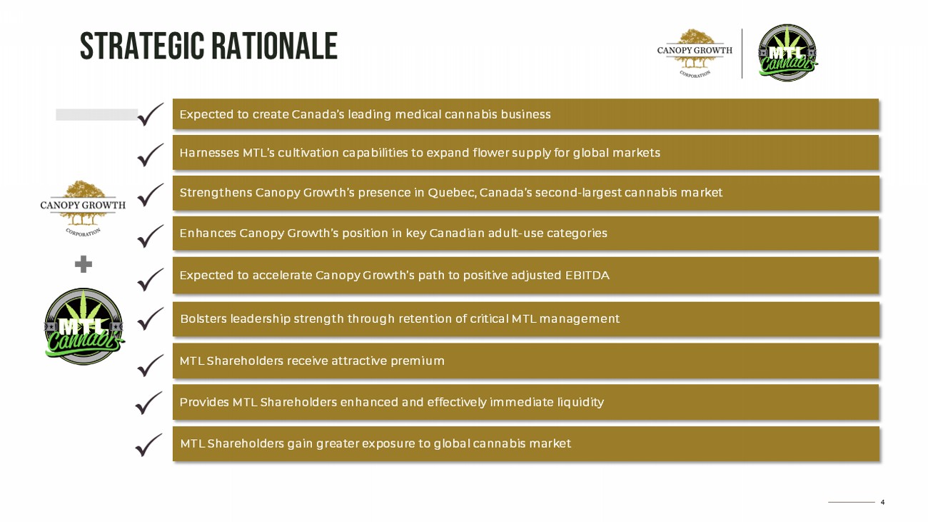 3 DISCLAIMERS AND CAUTIONARY STATEMENTS Forward - Looking Information (2/2) additional dilution ; political risks and risks relating to regulatory change, including with respect to reimbursement rates in the medical cannabis market ; risks relating to anti - money laundering laws ; compliance with extensive government regulation and the interpretation of various laws, regulations and policies ; public opinion and perception of the cannabis industry ; and such other risks contained in the public filings of Canopy Growth filed with Canadian securities regulators and available under Canopy’s profile on SEDAR+ at www . sedarplus . ca and with the United States Securities and Exchange Commission through EDGAR at www . sec . gov/edgar, including the factors discussed under the heading “Risk Factors” in the Company’s Annual Report on Form 10 - K for the fiscal year ended March 31 , 2025 and the risk factor discussed under the heading “Item 1 A . Risk Factors” in the Company’s Form 10 - Q for the quarterly period ended September 30 , 2025 , and in the public filings of MTL filed with Canadian securities regulators and available under MTL’s profile on SEDAR+ at www . sedarplus . ca . In respect of the forward - looking statements and information concerning the anticipated benefits and completion of the Transaction and the anticipated timing for completion of the Transaction, Canopy Growth and MTL have provided such statements and information in reliance on certain assumptions that they believe are reasonable at this time . Although Canopy Growth and MTL believe that the assumptions and factors used in preparing the forward - looking information or forward - looking statements in this Presentation are reasonable, undue reliance should not be placed on such information and no assurance can be given that such events will occur in the disclosed time frames or at all . Should one or more of the foregoing risks or uncertainties materialize, or should assumptions underlying the forward - looking information prove incorrect, actual results may vary materially from those described herein as intended, planned, anticipated, believed, estimated or expected . Although Canopy Growth and MTL have attempted to identify important risks, uncertainties and factors which could cause actual results to differ materially, there may be others that cause results not to be as anticipated, estimated or intended . The forward - looking information and forward - looking statements included in this Presentation are made as of the date of this Presentation and Canopy Growth and MTL do not undertake any obligation to publicly update such forward - looking information or forward - looking statements to reflect new information, subsequent events or otherwise unless required by applicable securities laws . Readers are cautioned not to put undue reliance on any forward - looking statement . Forward - looking statements contained in this Presentation are expressly qualified by this notice regarding forward - looking statements . MTL Cannabis prepares its financial statements in accordance with international financial reporting standards (“IFRS”) whereas Canopy Growth prepares its financial statements in accordance with U . S . generally accepted accounting principles (“U . S . GAAP”) . There are differences in the reporting frameworks between IFRS and U . S . GAAP and accordingly, the financial statements of MTL Cannabis may not be comparable with those of Canopy Growth . All financial information in this Presentation is reported in Canadian dollars unless otherwise indicated .
