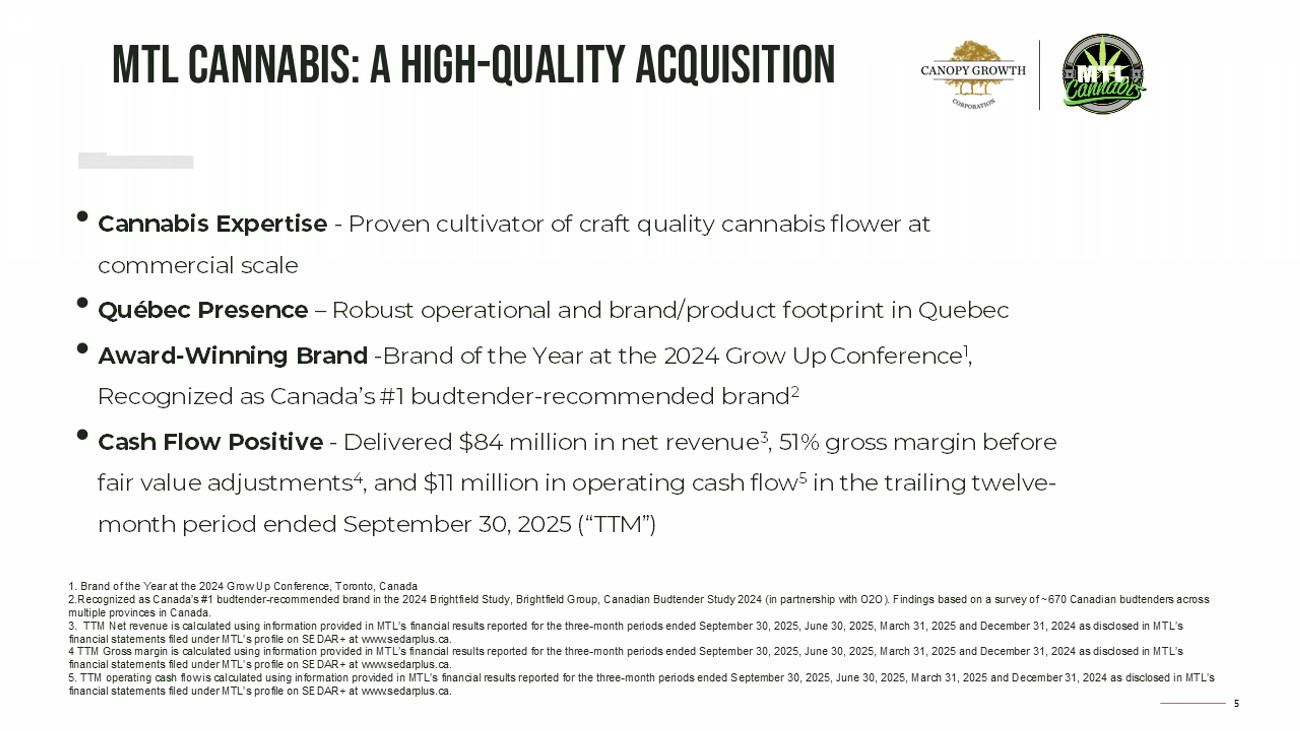 4 Strategic Rationale Expected to create Canada’s leading medical cannabis business H arness es MTL’s cultivation capabilities to expand flower supply for global markets Enhances Canopy Growth’s position in key Canadian adult - use categories Bolsters leadership strength through retention of critical MTL management Strengthens Canopy Growth’s presence in Quebec, Canada’s second - largest cannabis market Expected to accelerate Canopy Growth’s path to positive adjusted EBITDA MTL Shareholders receive attractive premium Provides MTL Shareholders enhanced and effectively immediate liquidity MTL Shareholders gain greater exposure to global cannabis market