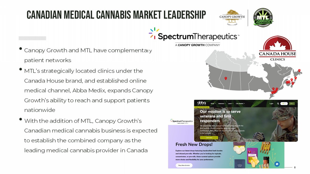 7 Transaction STRUCTURE AND SUPPORT Valuation Detail ❖ Total consideration is approximately $125 million for MTL Shares on a fully - diluted equity basis and approximately $179 million Enterprise Value Approvals ❖ Requires approval of at least two - thirds of the votes cast by MTL Cannabis shareholders + ❖ Simple majority of the votes cast by MTL Shareholders excluding for this purpose the votes attached to MTL Shares owned and/or controlled by any MTL Shareholders required to be excluded under Multilateral Instrument 61 - 101 Protection of Minority Security Holders in Special Transactions Support ❖ Directors, officers, and shareholders representing approximately 75% of MTL Shares have agreed to irrevocably vote in favor of the Transaction ❖ Approximately 72% of the Canopy Growth Shares to be issued for the issued and outstanding MTL Shares pursuant to the Arrangement are subject to a lock - up for a period of one year following closing, with staged releases of such Canopy Growth Shares Board Recommendation ❖ MTL Cannabis’ Board of Directors recommends that MTL shareholders vote in favour