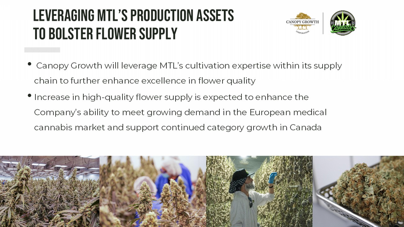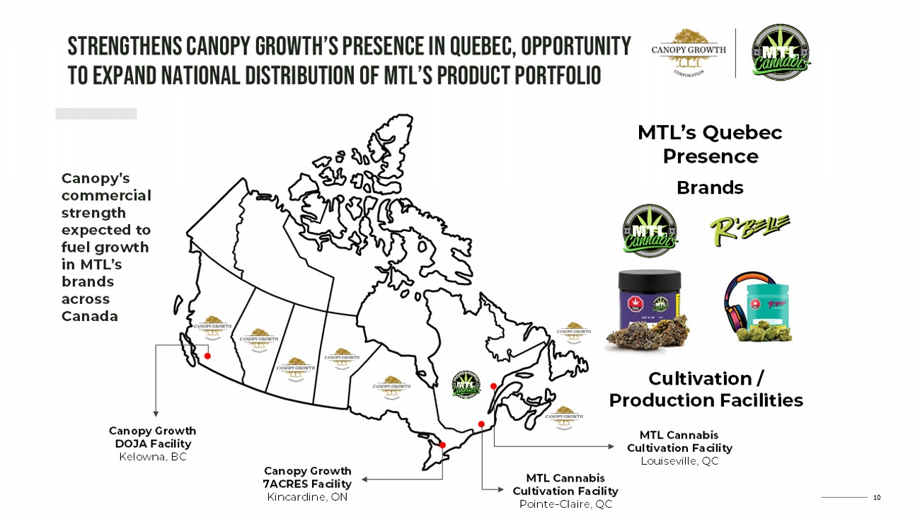 9 • Canopy Growth will leverage MTL’s cultivation expertise within its supply chain to further enhance excellence in flower quality • Increase in high - quality flower supply is expected to enhance the Company’s ability to meet growing demand in the European medical cannabis market and support continued category growth in Canada Leveraging MTL’s production assets to bolster flower supply