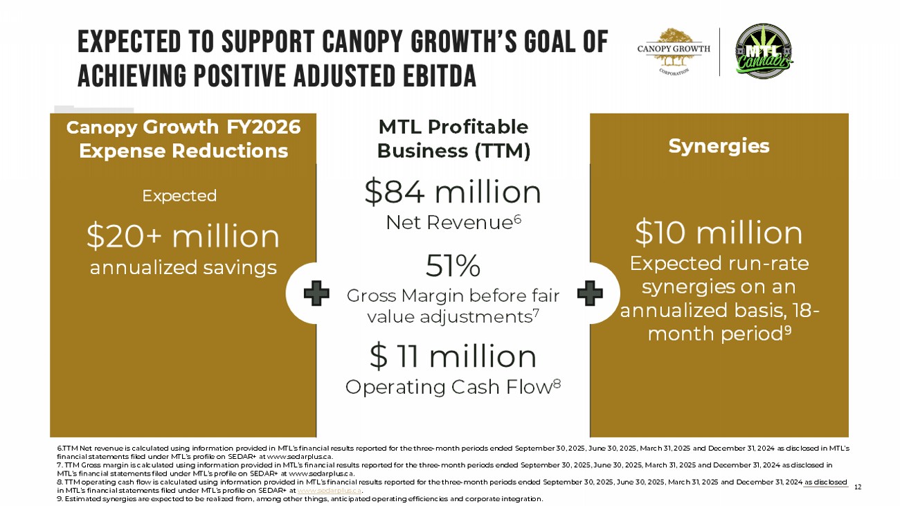 12 expected to support Canopy Growth’s goal of achieving positive adjusted EBITDA Synergies MTL Profitable Business (TTM) Canopy Growth FY2026 Expense Reductions $10 million Expected run - rate synergies on an annualized basis, 18 - month period 9 $84 million Net Revenue 6 51% Gross Margin before fair value adjustments 7 $ 11 million Operating Cash Flow 8 $20+ million annualized savings 6.TTM Net revenue is calculated using information provided in MTL’s financial results reported for the three - month periods ended September 30, 2025, June 30, 2025, March 31, 2025 and December 31, 2024 as disclosed in MTL’s financial statements filed under MTL’s profile on SEDAR+ at www.sedarplus.ca. 7. TTM Gross margin is calculated using information provided in MTL’s financial results reported for the three - month periods end ed September 30, 2025, June 30, 2025, March 31, 2025 and December 31, 2024 as disclosed in MTL’s financial statements filed under MTL’s profile on SEDAR+ at www.sedarplus.ca. 8. TTM operating cash flow is calculated using information provided in MTL’s financial results reported for the three - month peri ods ended September 30, 2025, June 30, 2025, March 31, 2025 and December 31, 2024 as disclosed in MTL’s financial statements filed under MTL’s profile on SEDAR+ at www.sedarplus.ca . 9. Estimated synergies are expected to be realized from, among other things, anticipated operating efficiencies and corporate in tegration. Expected