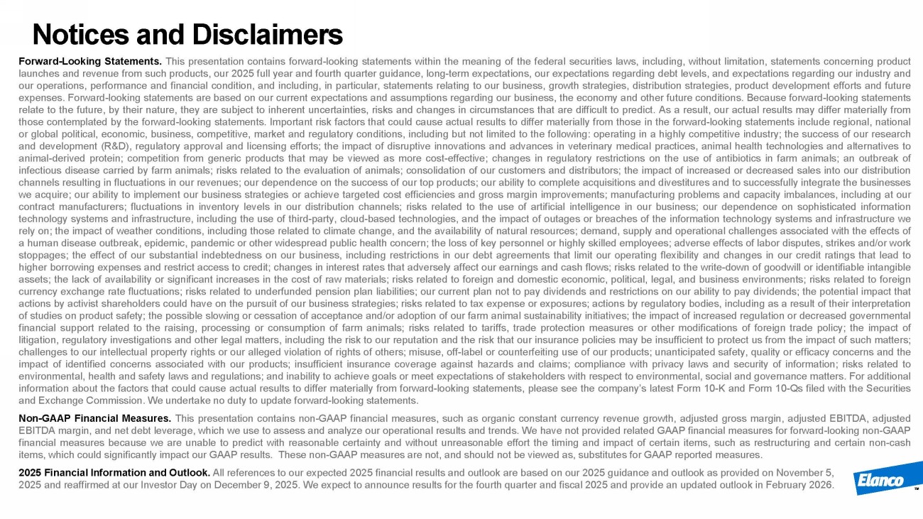 Notices and Disclaimers Forward - Looking Statements . This presentation contains forward - looking statements within the meaning of the federal securities laws, including, without limitation, statements concerning product launches and revenue from such products, our 2025 full year and fourth quarter guidance, long - term expectations, our expectations regarding debt levels, and expectations regarding our industry and our operations, performance and financial condition, and including, in particular, statements relating to our business, growth strategies, distribution strategies, product development efforts and future expenses . Forward - looking statements are based on our current expectations and assumptions regarding our business, the economy and other future conditions . Because forward - looking statements relate to the future, by their nature, they are subject to inherent uncertainties, risks and changes in circumstances that are difficult to predict . As a result, our actual results may differ materially from those contemplated by the forward - looking statements . Important risk factors that could cause actual results to differ materially from those in the forward - looking statements include regional, national or global political, economic, business, competitive, market and regulatory conditions, including but not limited to the following : operating in a highly competitive industry ; the success of our research and development (R&D), regulatory approval and licensing efforts ; the impact of disruptive innovations and advances in veterinary medical practices, animal health technologies and alternatives to animal - derived protein ; competition from generic products that may be viewed as more cost - effective ; changes in regulatory restrictions on the use of antibiotics in farm animals ; an outbreak of infectious disease carried by farm animals ; risks related to the evaluation of animals ; consolidation of our customers and distributors ; the impact of increased or decreased sales into our distribution channels resulting in fluctuations in our revenues ; our dependence on the success of our top products ; our ability to complete acquisitions and divestitures and to successfully integrate the businesses we acquire ; our ability to implement our business strategies or achieve targeted cost efficiencies and gross margin improvements ; manufacturing problems and capacity imbalances, including at our contract manufacturers ; fluctuations in inventory levels in our distribution channels ; risks related to the use of artificial intelligence in our business ; our dependence on sophisticated information technology systems and infrastructure, including the use of third - party, cloud - based technologies, and the impact of outages or breaches of the information technology systems and infrastructure we rely on ; the impact of weather conditions, including those related to climate change, and the availability of natural resources ; demand, supply and operational challenges associated with the effects of a human disease outbreak, epidemic, pandemic or other widespread public health concern ; the loss of key personnel or highly skilled employees ; adverse effects of labor disputes, strikes and/or work stoppages ; the effect of our substantial indebtedness on our business, including restrictions in our debt agreements that limit our operating flexibility and changes in our credit ratings that lead to higher borrowing expenses and restrict access to credit ; changes in interest rates that adversely affect our earnings and cash flows ; risks related to the write - down of goodwill or identifiable intangible assets ; the lack of availability or significant increases in the cost of raw materials ; risks related to foreign and domestic economic, political, legal, and business environments ; risks related to foreign currency exchange rate fluctuations ; risks related to underfunded pension plan liabilities ; our current plan not to pay dividends and restrictions on our ability to pay dividends ; the potential impact that actions by activist shareholders could have on the pursuit of our business strategies ; risks related to tax expense or exposures ; actions by regulatory bodies, including as a result of their interpretation of studies on product safety ; the possible slowing or cessation of acceptance and/or adoption of our farm animal sustainability initiatives ; the impact of increased regulation or decreased governmental financial support related to the raising, processing or consumption of farm animals ; risks related to tariffs, trade protection measures or other modifications of foreign trade policy ; the impact of litigation, regulatory investigations and other legal matters, including the risk to our reputation and the risk that our insurance policies may be insufficient to protect us from the impact of such matters ; challenges to our intellectual property rights or our alleged violation of rights of others ; misuse, off - label or counterfeiting use of our products ; unanticipated safety, quality or efficacy concerns and the impact of identified concerns associated with our products ; insufficient insurance coverage against hazards and claims ; compliance with privacy laws and security of information ; risks related to environmental, health and safety laws and regulations ; and inability to achieve goals or meet expectations of stakeholders with respect to environmental, social and governance matters . For additional information about the factors that could cause actual results to differ materially from forward - looking statements, please see the company’s latest Form 10 - K and Form 10 - Qs filed with the Securities and Exchange Commission . We undertake no duty to update forward - looking statements . Non - GAAP Financial Measures . This presentation contains non - GAAP financial measures, such as organic constant currency revenue growth, adjusted gross margin, adjusted EBITDA, adjus