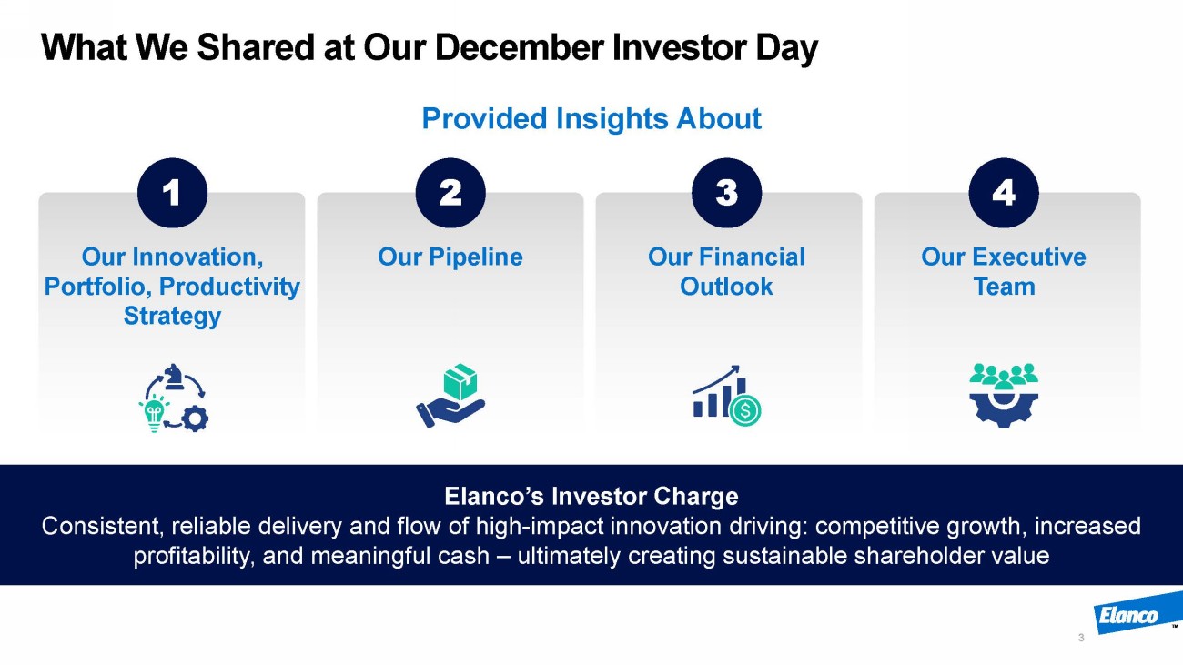 What We Shared at Our December Investor Day 3 1 2 3 4 Our Innovation, Portfolio, Productivity Strategy Our Pipeline Our Financial Outlook Our Executive Team Provided Insights About Elanco’s Investor Charge Consistent, reliable delivery and flow of high - impact innovation driving: competitive growth, increased profitability, and meaningful cash – ultimately creating sustainable shareholder value