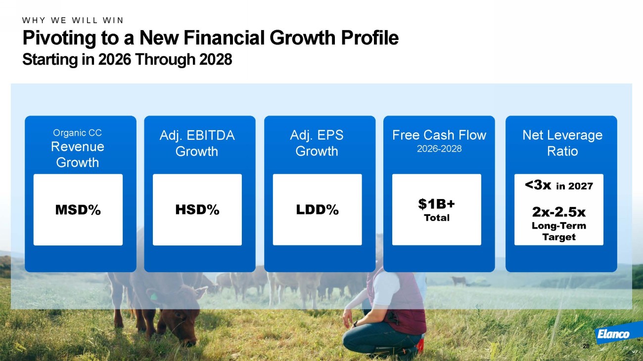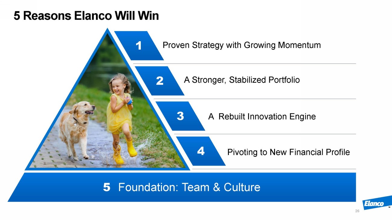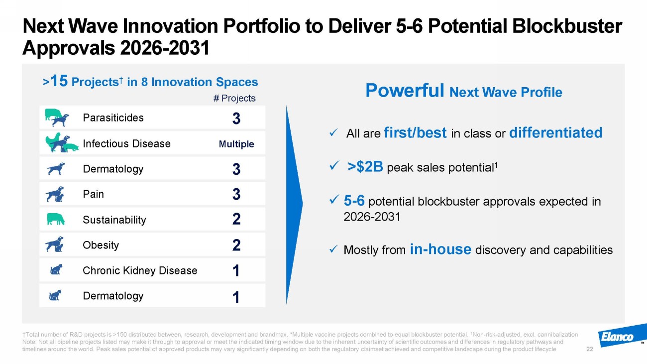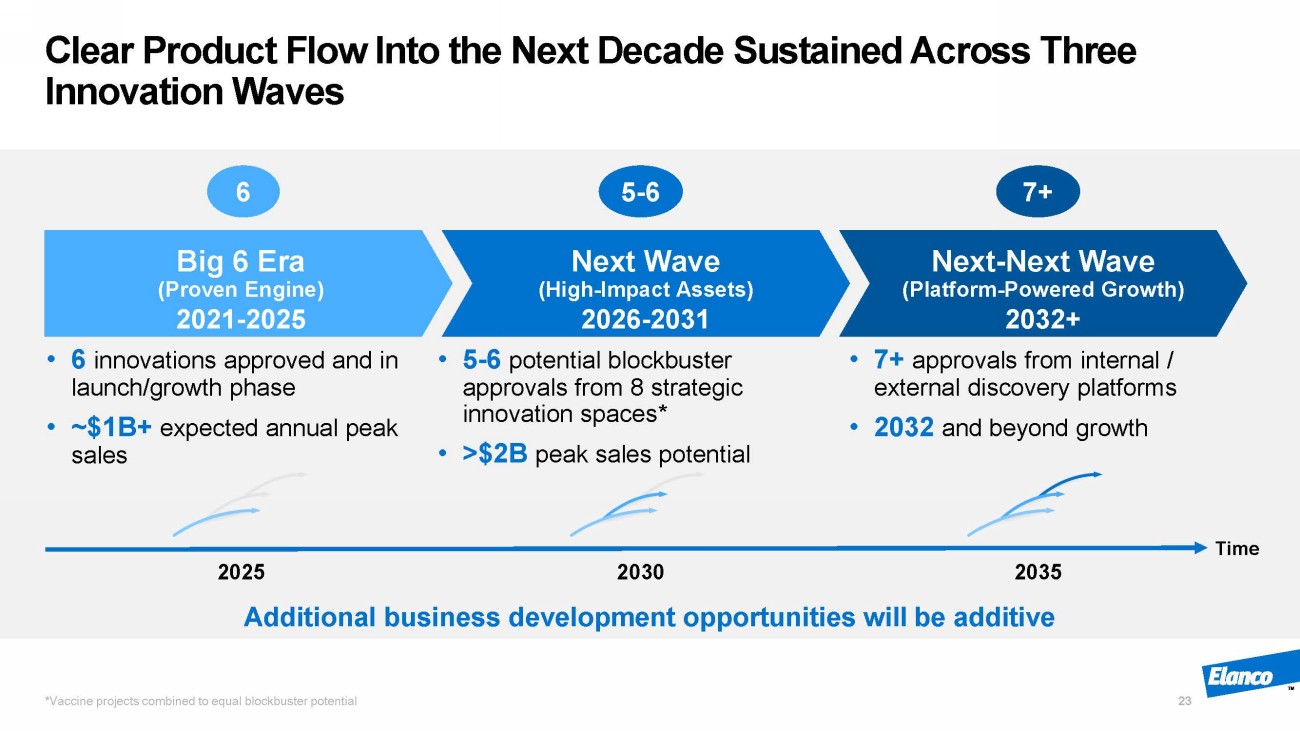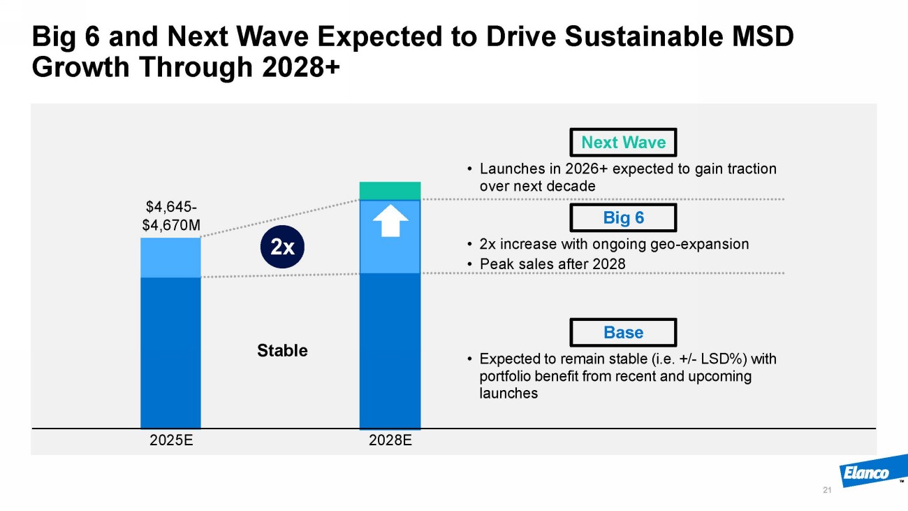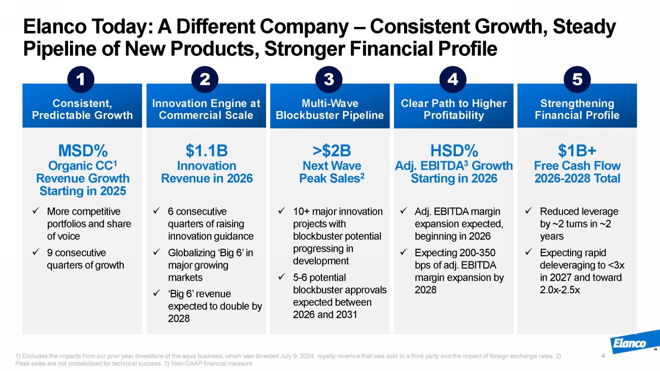 Consistent, Predictable Growth Multi - Wave Blockbuster Pipeline Strengthening Financial Profile Innovation Engine at Commercial Scale Clear Path to Higher Profitability Elanco Today: A Different Company – Consistent Growth, Steady Pipeline of New Products, Stronger Financial Profile 4 1 2 3 5 4 MSD% Organic CC 1 Revenue Growth Starting in 2025 $1.1B I nnovation Revenue in 2026 >$2B Next Wave Peak Sales 2 $1B+ Free Cash Flow 2026 - 2028 Total x More competitive portfolios and share of voice x 9 consecutive quarters of growth x 6 consecutive quarters of raising innovation guidance x Globalizing ‘Big 6’ in major growing markets x ‘ Big 6’ revenue expected to double by 2028 x 10+ major innovation projects with blockbuster potential progressing in development x 5 - 6 potential blockbuster approvals expected between 2026 and 2031 x Adj. EBITDA margin expansion expected, beginning in 2026 x Expecting 200 - 350 bps of adj. EBITDA margin expansion by 2028 x Reduced leverage by ~2 turns in ~2 years x Expecting rapid deleveraging to <3x in 2027 and toward 2.0x - 2.5x HSD% Adj. EBITDA 3 Growth Starting in 2026 1) Excludes the impacts from our prior year divestiture of the aqua business, which was divested July 9, 2024, royalty revenu e t hat was sold to a third party and the impact of foreign exchange rates. 2) Peak sales are not probabilized for technical success. 3) Non - GAAP financial measure