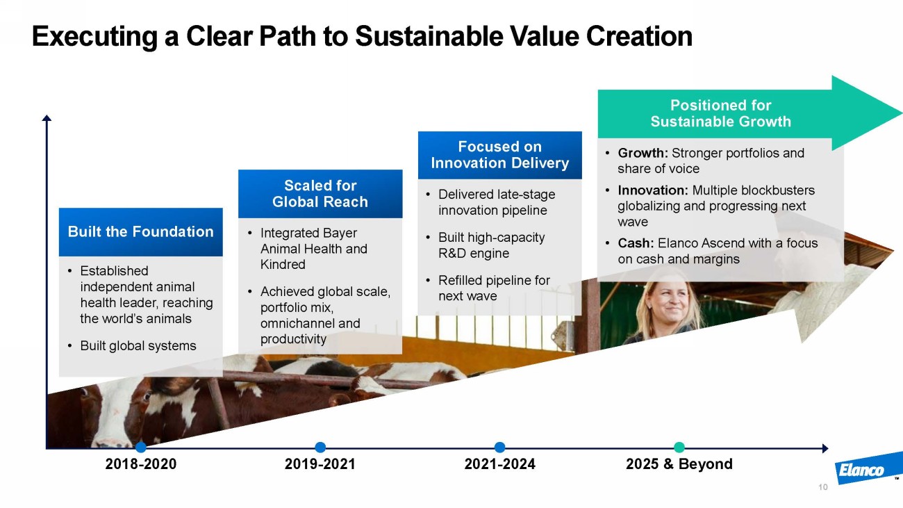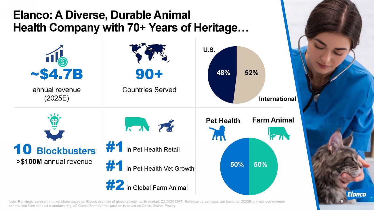 Elanco: A Diverse, Durable Animal Health Company with 70+ Years of Heritage… 9 10 Blockbusters >$100M annual revenue ~$4.7B annual revenue (2025E) 90+ Countries Served #1 in Pet Health Retail #1 in Pet Health Vet Growth #2 in Global Farm Animal 52% 48% International U.S. Pet Health Farm Animal 50% 50 % Note: Rankings represent m arket share based on Elanco estimate of global animal health market, Q2 2025 MAT. Revenue percentages are based on 2025E and exclude revenue contribution from contract manufacturing. #2 Global Farm Animal position is based on Cattle, Swine, Poultry