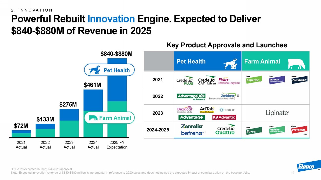 Farm Animal Pet Health 2021 2022 2023 2024 - 2025 2. INNOVATION Powerful Rebuilt Innovation Engine. Expected to Deliver $840 - $880M of Revenue in 2025 1 H1 2026 expected launch; Q4 2025 approval Note: Expected innovation revenue of $840 - $880 million is incremental in reference to 2020 sales and does not include the expect ed impact of cannibalization on the base portfolio. 14 Key Product Approvals and Launches 2021 Actual 2022 Actual 2023 Actual 2024 Actual 2025 FY Expectation $72M $133M $275M $461M $840 - $880M Pet Health Farm Animal 1