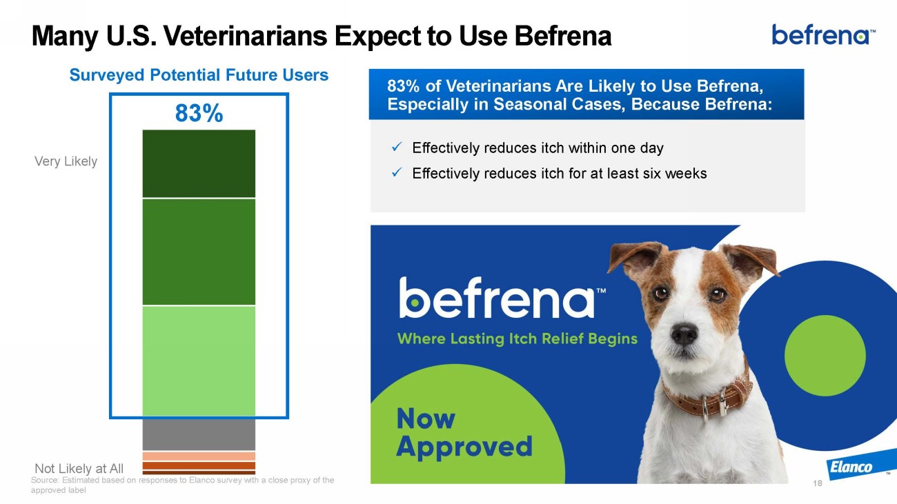 Befrena : Building Our Differentiated Portfolio Zenrelia and Befrena : Meaningful Growth Trajectory in Derm Q3 U.S. sales nearly doubled vs. Q2; momentum extended into October; achieved 5% patient share 2 1,900 new purchasers following September label update tor remove vaccine - induced disease language Additional data submitted to FDA to address vaccination response Differentiation on convenience, value, and efficacy Q4 2025 approval Continue to expect H1 2026 commercialization Elanco Is Well Positioned for Growth Through Differentiated Innovation to Address Unmet Needs Dermatology continues to be the #1 reason pet owners take their dogs to the vet $1.3B U.S. Derm Market w ith Strong Growth 1 Our Next Expected Blockbuster as Efficacy Matters 54% 37% 9% JAK - I Other IL - 31 17 1 Internal estimates based on multiple data sources 2 Kynetec Dispensing