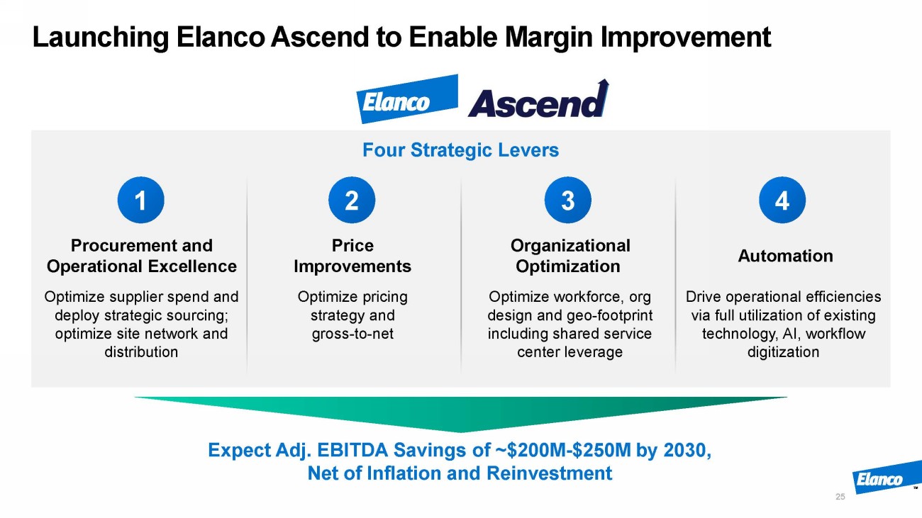 Launching Elanco Ascend to Enable Margin Improvement 25 Procurement and Operational Excellence Optimize supplier spend and deploy strategic sourcing; optimize site network and distribution Organizational Optimization Optimize workforce, org design and geo - footprint including shared service center leverage Automation Drive operational efficiencies via full utilization of existing technology, AI, workflow digitization Price Improvements Optimize pricing strategy and gross - to - net 1 2 3 4 Four Strategic Levers Expect Adj. EBITDA Savings of ~$200M - $250M by 2030, Net of Inflation and Reinvestment