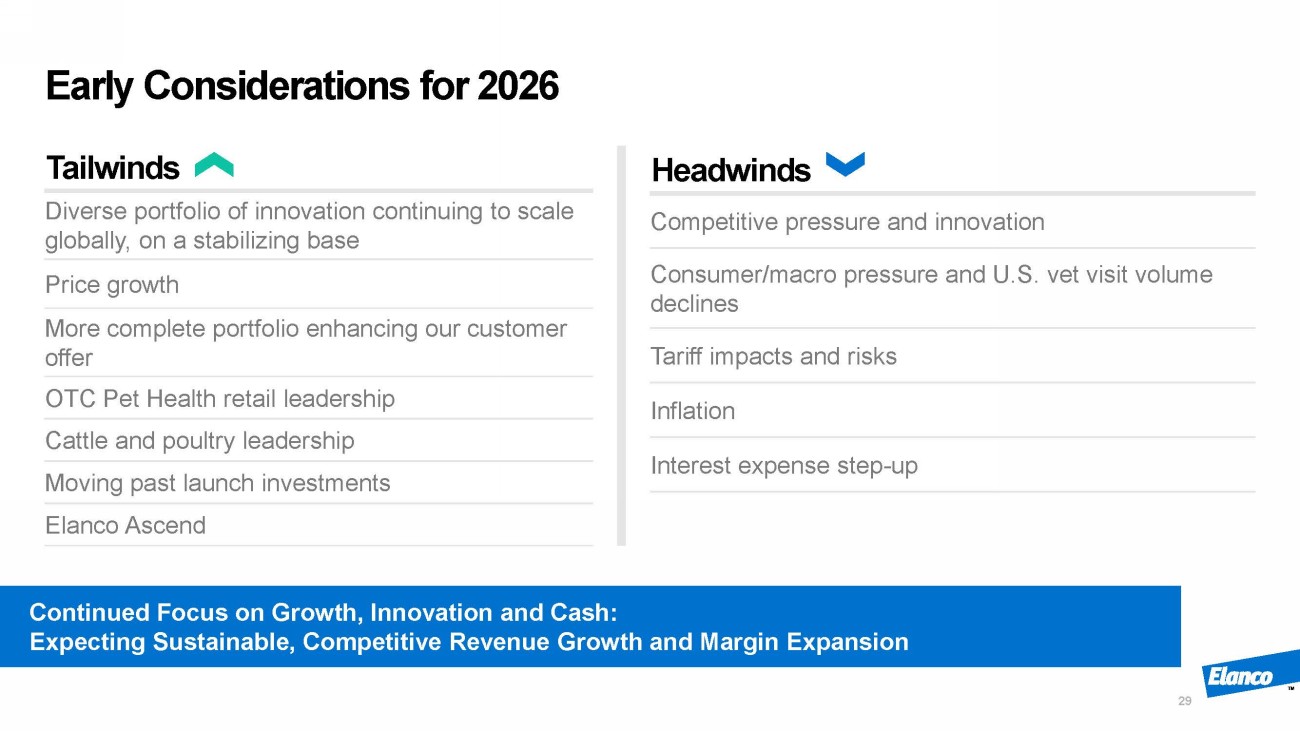 Tailwinds Diverse portfolio of innovation continuing to scale globally, on a stabilizing base Price growth More complete portfolio enhancing our customer offer OTC Pet Health retail leadership Cattle and poultry leadership Moving past launch investments Elanco Ascend Headwinds Competitive pressure and innovation Consumer/macro pressure and U.S. vet visit volume declines Tariff impacts and risks Inflation Interest expense step - up Early Considerations for 2026 Continued Focus on Growth, Innovation and Cash: Expecting Sustainable, Competitive Revenue Growth and Margin Expansion 29