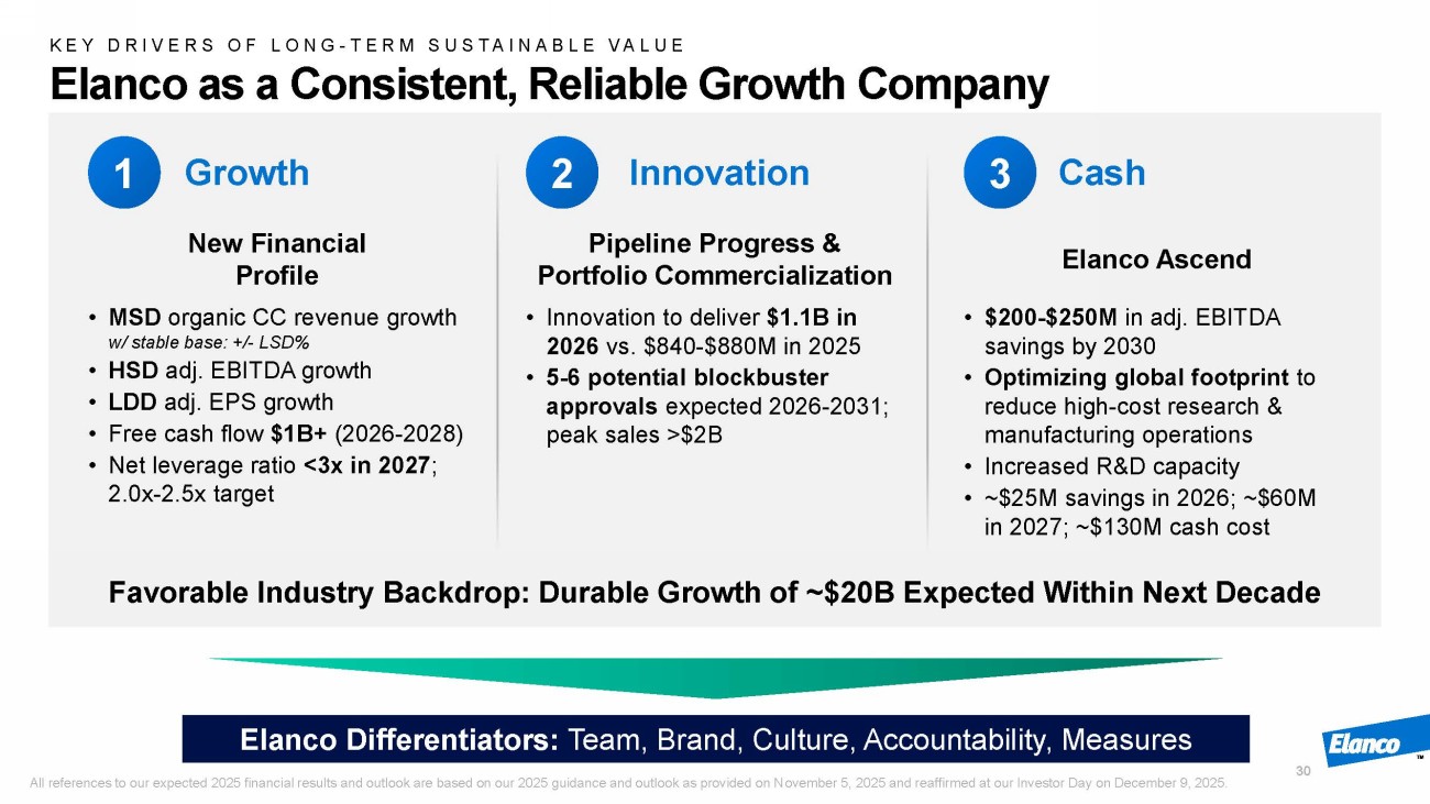 30 New Financial Profile • MSD o rganic CC r evenue growth w/ stable base: +/ - LSD% • HSD adj. EBITDA growth • LDD adj. EPS growth • Free cash flow $1B+ (2026 - 2028) • Net leverage r atio < 3x in 2027 ; 2.0x - 2.5x target Elanco Ascend • $200 - $250M in adj. EBITDA savings by 2030 • Optimizing global footprint to reduce high - cost research & manufacturing operations • Increased R&D capacity • ~$25M savings in 2026; ~$60M in 2027; ~$130M cash cost Pipeline Progress & Portfolio Commercialization • Innovation to deliver $1.1B in 2026 vs. $840 - $880M in 2025 • 5 - 6 potential blockbuster approvals expected 2026 - 2031; peak sales >$2B 1 2 3 Elanco Differentiators: Team, Brand, Culture, Accountability, Measures KEY DRIVERS OF LONG - TERM SUSTAINABLE VALUE Elanco as a Consistent, Reliable Growth Company Favorable Industry Backdrop: Durable Growth of ~$20B Expected Within Next Decade Growth Cash Innovation All references to our expected 2025 financial results and outlook are based on our 2025 guidance and outlook as provided on N ove mber 5, 2025 and reaffirmed at our Investor Day on December 9, 2025.