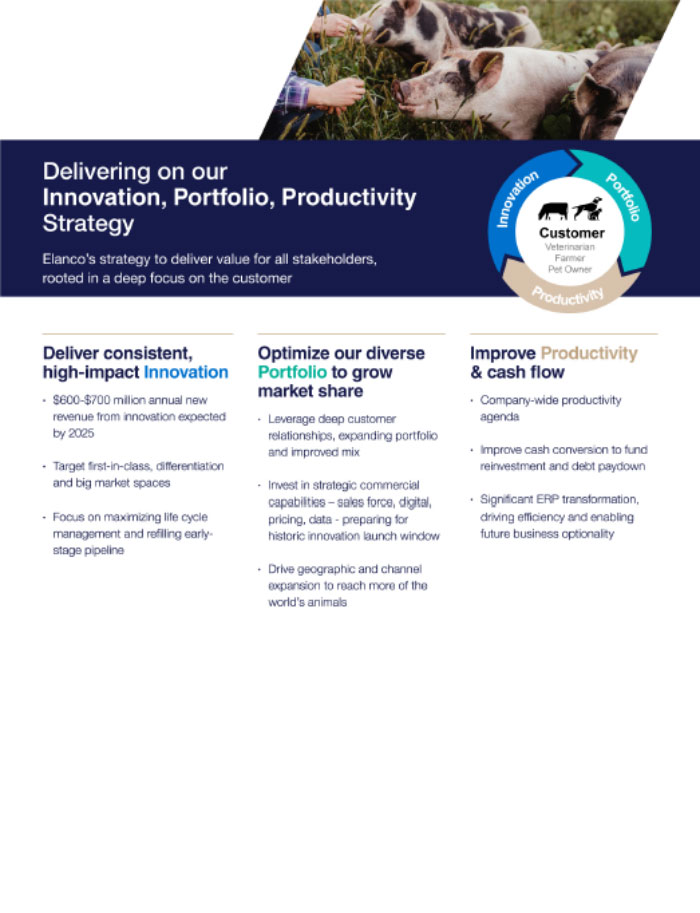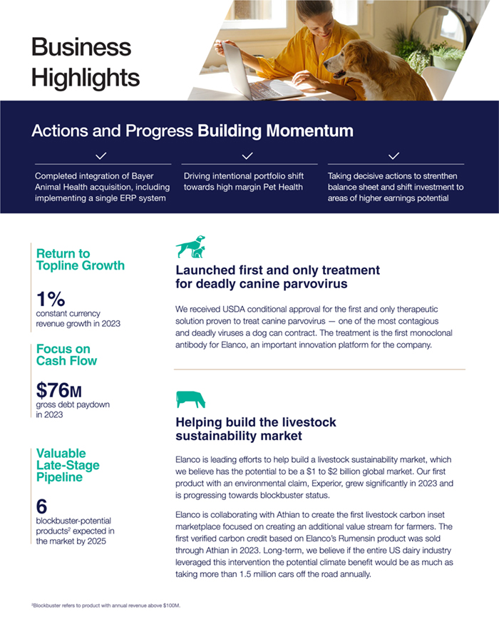 In 2023, Elanco demonstrated progress and momentum on our Innovation, Portfolio and Productivity (IPP) strategy to deliver long-term shareholder value. We returned to revenue growth and made meaningful progress on our pipeline of potential blockbuster products, while completing our ERP system integration, a significant milestone that will significantly improve free cash flow for debt pay down. Since our IPO in 2018, we have expanded our portfolio and scale through strategic acquisitions, positioned Elanco as the omnichannel Pet Health leader around the globe and are now well-positioned to deliver on our next era of innovation and growth.