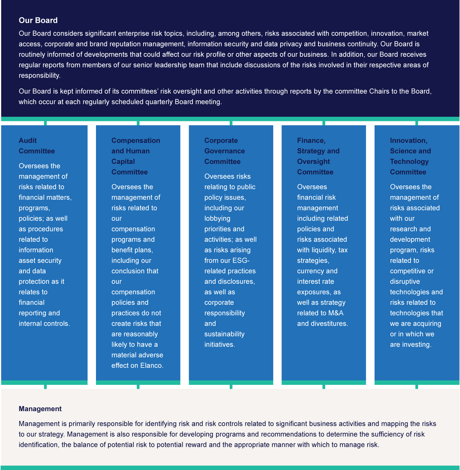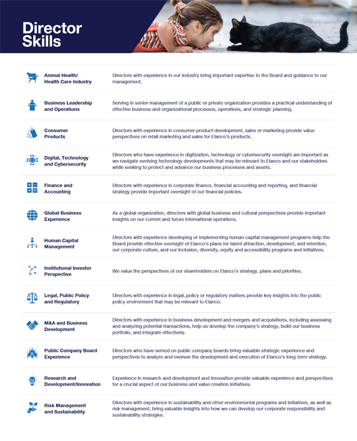 Since Elanco’s launch as an independent company five years ago, the Board of Directors has taken decisive actions to help Elanco mature into a company now positioned to deliver sustainable, profitable growth over the long term. Along with that maturity, the Board and company leadership have enacted and proposed a number of governance enhancements that promote accountability and align with best-practice shareholder expectations.