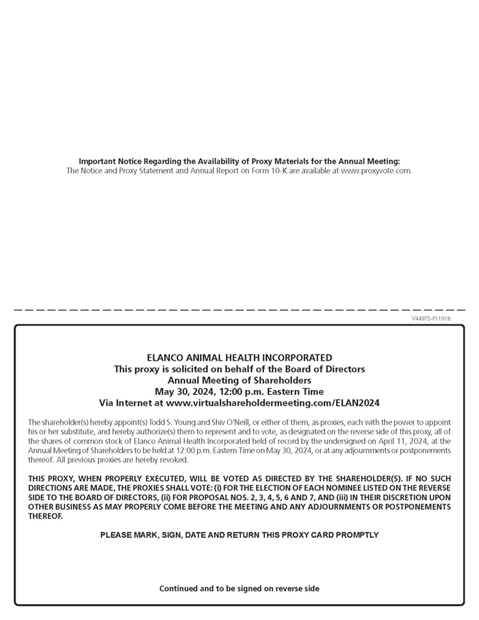 The 2024 Annual Meeting of Shareholders of ELANCO ANIMAL HEALTH INCORPORATED, an Indiana corporation, will be a virtual meeting of shareholders, conducted via live audio webcast at www.virtualshareholdermeeting.com/ELAN2024 on Thursday, May 30, 2024, at 12:00 p.m., Eastern Time, to consider and act upon the following matters: