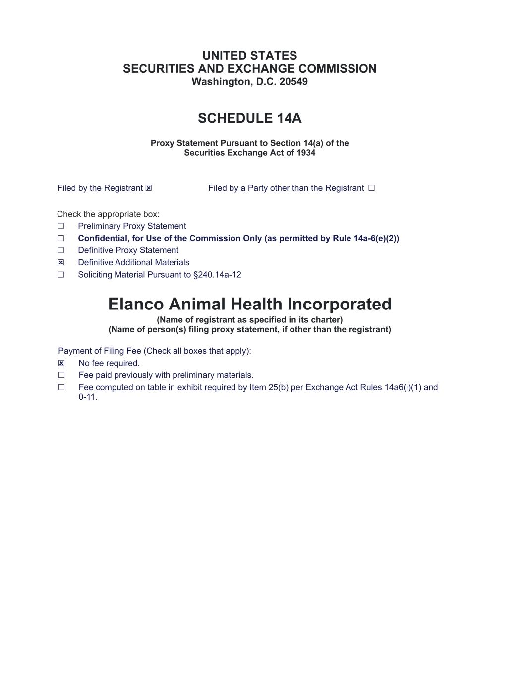 UNITED STATES SECURITIES AND EXCHANGE COMMISSION Washington, D.C. 20549 SCHEDULE 14A Proxy Statement Pursuant to Section 14(a) of the Securities Exchange Act of 1934 Filed by the Registrant ☒ Filed by a Party other than the Registrant ☐ Check the appropriate box: ☐ Preliminary Proxy Statement ☐ Confidential, for Use of the Commission Only (as permitted by Rule 14a-6(e)(2)) ☐ Definitive Proxy Statement ☒ Definitive Additional Materials ☐ Soliciting Material Pursuant to §240.14a-12 Elanco Animal Health Incorporated (Name of registrant as specified in its charter) (Name of person(s) filing proxy statement, if other than the registrant) Payment of Filing Fee (Check all boxes that apply): ☒ No fee required. ☐ Fee paid previously with preliminary materials. ☐ Fee computed on table in exhibit required by Item 25(b) per Exchange Act Rules 14a6(i)(1) and 0-11.