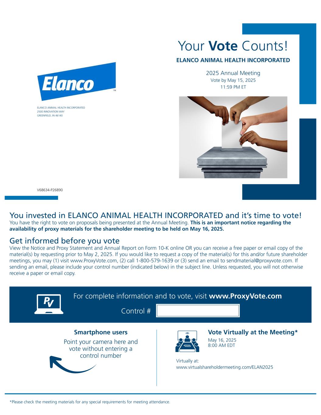 Your Vote Counts! *Please check the meeting materials for any special requirements for meeting attendance. Smartphone users Point your camera here and vote without entering a control number For complete information and to vote, visit www.ProxyVote.com Control # V68634-P26890 ELANCO ANIMAL HEALTH INCORPORATED 2500 INNOVATION WAY GREENFIELD, IN 46140 ELANCO ANIMAL HEALTH INCORPORATED 2025 Annual Meeting Vote by May 15, 2025 11:59 PM ET You invested in ELANCO ANIMAL HEALTH INCORPORATED and it’s time to vote! You have the right to vote on proposals being presented at the Annual Meeting. This is an important notice regarding the availability of proxy materials for the shareholder meeting to be held on May 16, 2025. Vote Virtually at the Meeting* May 16, 2025 8:00 AM EDT Virtually at: www.virtualshareholdermeeting.com/ELAN2025 Get informed before you vote View the Notice and Proxy Statement and Annual Report on Form 10-K online OR you can receive a free paper or email copy of the material(s) by requesting prior to May 2, 2025. If you would like to request a copy of the material(s) for this and/or future shareholder meetings, you may (1) visit www.ProxyVote.com, (2) call 1-800-579-1639 or (3) send an email to sendmaterial@proxyvote.com. If sending an email, please include your control number (indicated below) in the subject line. Unless requested, you will not otherwise receive a paper or email copy.