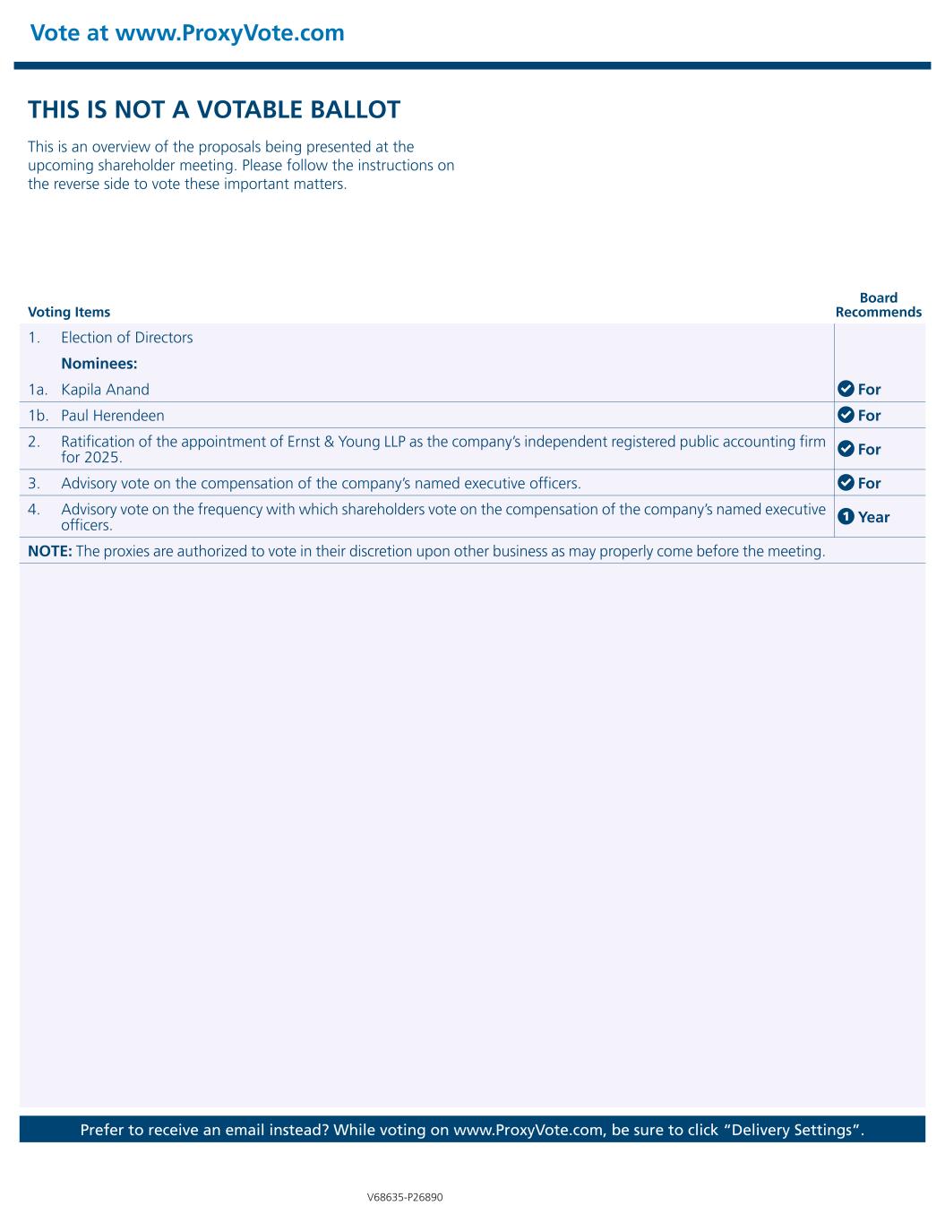 Vote at www.ProxyVote.com Prefer to receive an email instead? While voting on www.ProxyVote.com, be sure to click “Delivery Settings”. Voting Items Board Recommends V68635-P26890 THIS IS NOT A VOTABLE BALLOT This is an overview of the proposals being presented at the upcoming shareholder meeting. Please follow the instructions on the reverse side to vote these important matters. 1. Election of Directors Nominees: 1a. Kapila Anand For 1b. Paul Herendeen For 2. Ratification of the appointment of Ernst & Young LLP as the company’s independent registered public accounting firm for 2025. For 3. Advisory vote on the compensation of the company’s named executive officers. For 4. Advisory vote on the frequency with which shareholders vote on the compensation of the company’s named executive officers. 1 Year NOTE: The proxies are authorized to vote in their discretion upon other business as may properly come before the meeting.