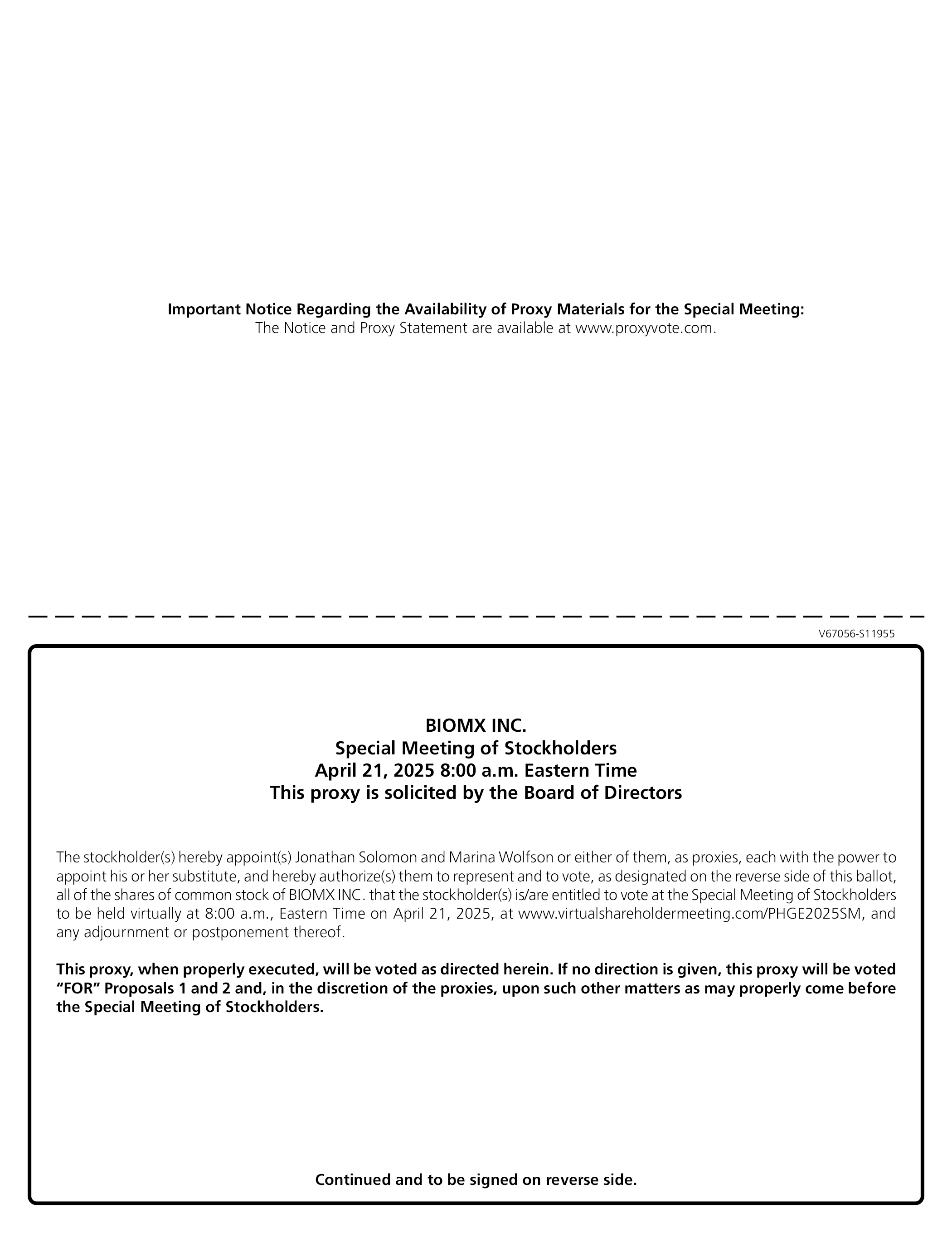 Important Notice Regarding the Availability of Proxy Materials for the Special Meeting:The Notice and Proxy Statement are available at www.proxyvote.com. BIOMX INC. Special Meeting of Stockholders April 21, 2025 8:00 a.m. Eastern Time This proxy is solicited by the Board of Directors The stockholder(s) hereby appoint(s) Jonathan Solomon and Marina Wolfson or either of them, as proxies, each with the power to appoint his or her substitute, and hereby authorize(s) them to represent and to vote, as designated on the reverse side of this ballot, all of the shares of common stock of BIOMX INC. that the stockholder(s) is/are entitled to vote at the Special Meeting of Stockholdersto be held virtually at 8:00 a.m., Eastern Time on April 21, 2025, at www.virtualshareholdermeeting.com/PHGE2025SM, and any adjournment or postponement thereof. This proxy, when properly executed, will be voted as directed herein. If no direction is given, this proxy will be voted “FOR” Proposals 1 and 2 and, in the discretion of the proxies, upon such other matters as may properly come before the Special Meeting of Stockholders. Continued and to be signed on reverse side. V67056-S11955