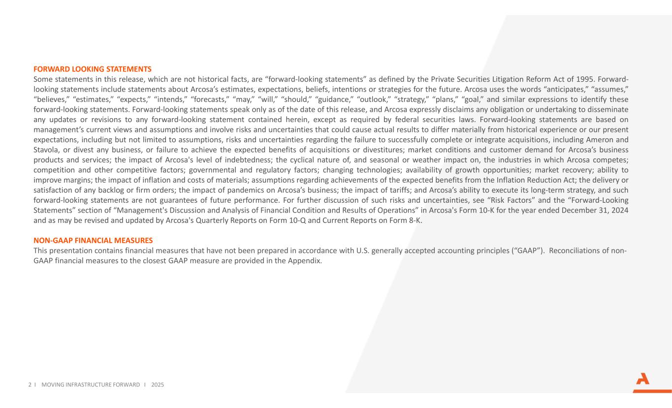 2 I    MOVING INFRASTRUCTURE FORWARD   I    2025 FORWARD LOOKING STATEMENTS Some statements in this release, which are not historical facts, are “forward-looking statements” as defined by the Private Securities Litigation Reform Act of 1995. Forward- looking statements include statements about Arcosa’s estimates, expectations, beliefs, intentions or strategies for the future. Arcosa uses the words “anticipates,” “assumes,” “believes,” “estimates,” “expects,” “intends,” “forecasts,” “may,” “will,” “should,” “guidance,” “outlook,” “strategy,” “plans,” “goal,” and similar expressions to identify these forward-looking statements. Forward-looking statements speak only as of the date of this release, and Arcosa expressly disclaims any obligation or undertaking to disseminate any updates or revisions to any forward-looking statement contained herein, except as required by federal securities laws. Forward-looking statements are based on management’s current views and assumptions and involve risks and uncertainties that could cause actual results to differ materially from historical experience or our present expectations, including but not limited to assumptions, risks and uncertainties regarding the failure to successfully complete or integrate acquisitions, including Ameron and Stavola, or divest any business, or failure to achieve the expected benefits of acquisitions or divestitures; market conditions and customer demand for Arcosa’s business products and services; the impact of Arcosa's level of indebtedness; the cyclical nature of, and seasonal or weather impact on, the industries in which Arcosa competes; competition and other competitive factors; governmental and regulatory factors; changing technologies; availability of growth opportunities; market recovery; ability to improve margins; the impact of inflation and costs of materials; assumptions regarding achievements of the expected benefits from the Inflation Reduction Act; the delivery or satisfaction of any backlog or firm orders; the impact of pandemics on Arcosa’s business; the impact of tariffs; and Arcosa’s ability to execute its long-term strategy, and such forward-looking statements are not guarantees of future performance. For further discussion of such risks and uncertainties, see “Risk Factors” and the “Forward-Looking Statements” section of “Management's Discussion and Analysis of Financial Condition and Results of Operations” in Arcosa's Form 10-K for the year ended December 31, 2024 and as may be revised and updated by Arcosa's Quarterly Reports on Form 10-Q and Current Reports on Form 8-K. NON-GAAP FINANCIAL MEASURES This presentation contains financial measures that have not been prepared in accordance with U.S. generally accepted accounting principles (“GAAP”).  Reconciliations of non- GAAP financial measures to the closest GAAP measure are provided in the Appendix.