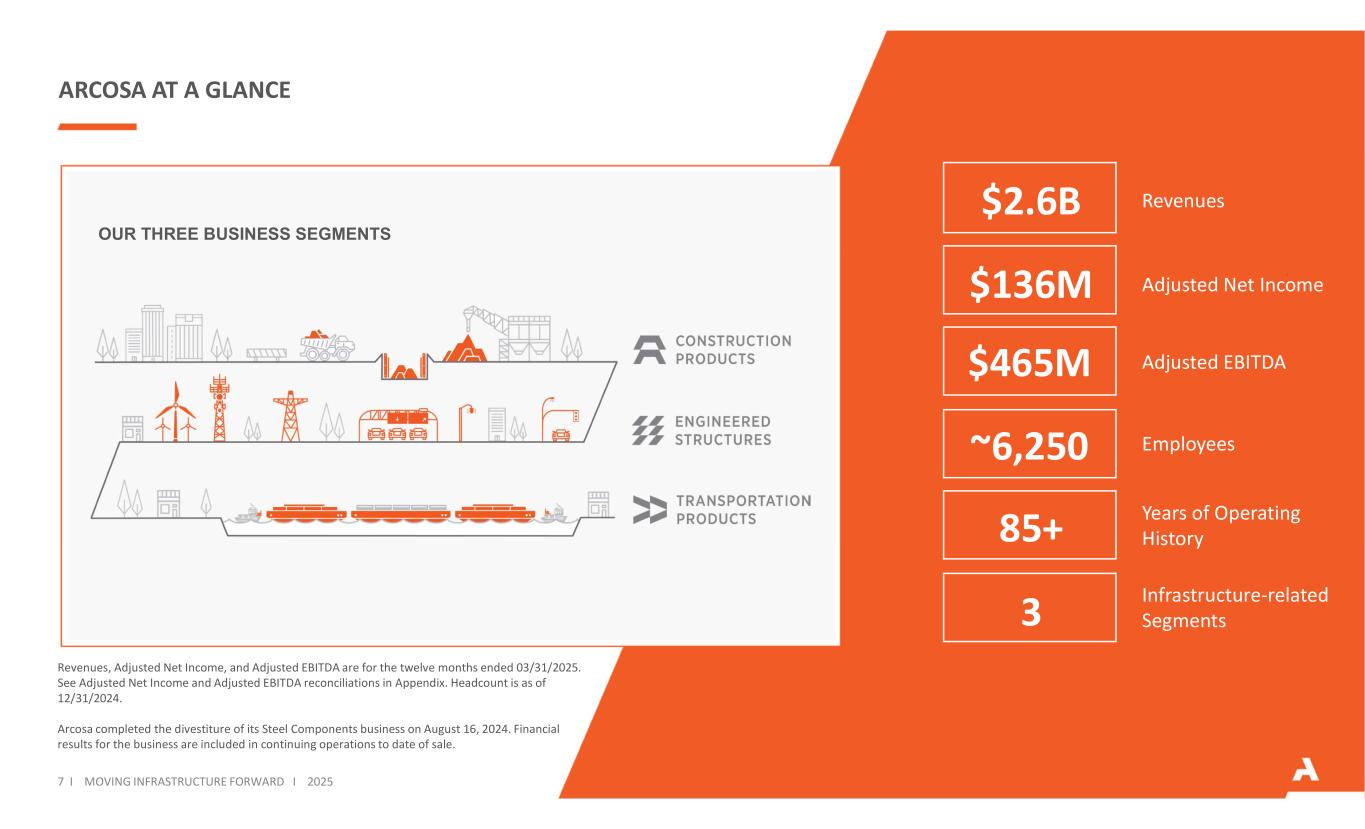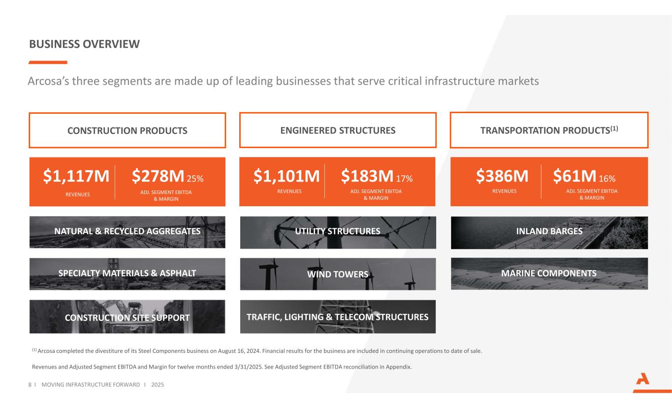 ARCOSA AT A GLANCE Revenues, Adjusted Net Income, and Adjusted EBITDA are for the twelve months ended 03/31/2025.  See Adjusted Net Income and Adjusted EBITDA reconciliations in Appendix. Headcount is as of  12/31/2024. Arcosa completed the divestiture of its Steel Components business on August 16, 2024. Financial  results for the business are included in continuing operations to date of sale. Adjusted Net Income Adjusted EBITDA Infrastructure-related  Segments Employees Years of Operating  History OUR THREE BUSINESS SEGMENTS Revenues$2.6B $136M $465M ~6,250 85+ 3 7 I    MOVING INFRASTRUCTURE FORWARD   I    2025