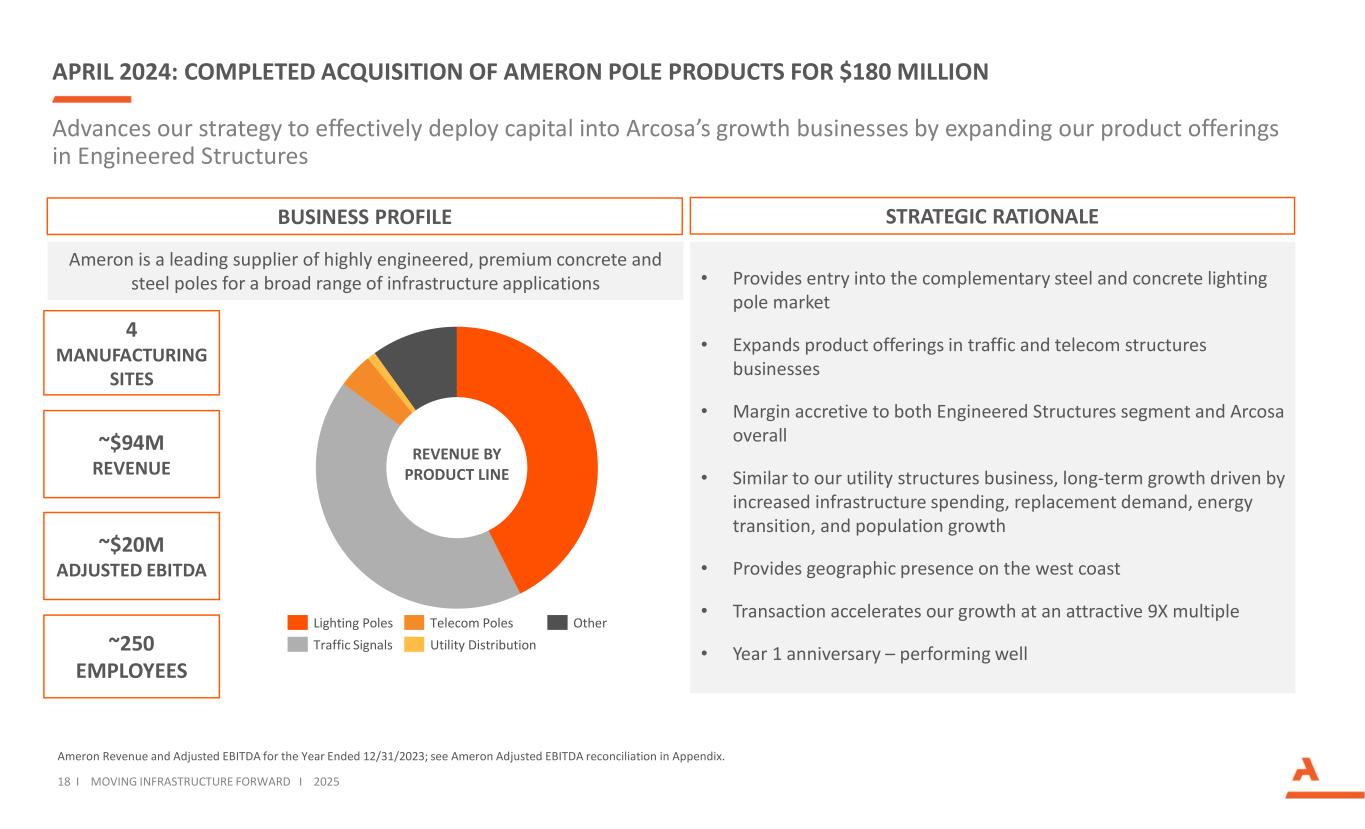 APRIL 2024: COMPLETED ACQUISITION OF AMERON POLE PRODUCTS FOR $180 MILLION • Provides entry into the complementary steel and concrete lighting  pole market • Expands product offerings in traffic and telecom structures  businesses • Margin accretive to both Engineered Structures segment and Arcosa  overall • Similar to our utility structures business, long-term growth driven by  increased infrastructure spending, replacement demand, energy  transition, and population growth • Provides geographic presence on the west coast • Transaction accelerates our growth at an attractive 9X multiple • Year 1 anniversary – performing well 18 I    MOVING INFRASTRUCTURE FORWARD   I    2025 Advances our strategy to effectively deploy capital into Arcosa’s growth businesses by expanding our product offerings  in Engineered Structures Ameron Revenue and Adjusted EBITDA for the Year Ended 12/31/2023; see Ameron Adjusted EBITDA reconciliation in Appendix. BUSINESS PROFILE Ameron is a leading supplier of highly engineered, premium concrete and  steel poles for a broad range of infrastructure applications ~250  EMPLOYEES STRATEGIC RATIONALE 4   MANUFACTURING  SITES ~$20M ADJUSTED EBITDA Lighting Poles Traffic Signals Telecom Poles Utility Distribution Other REVENUE BY  PRODUCT LINE ~$94M REVENUE