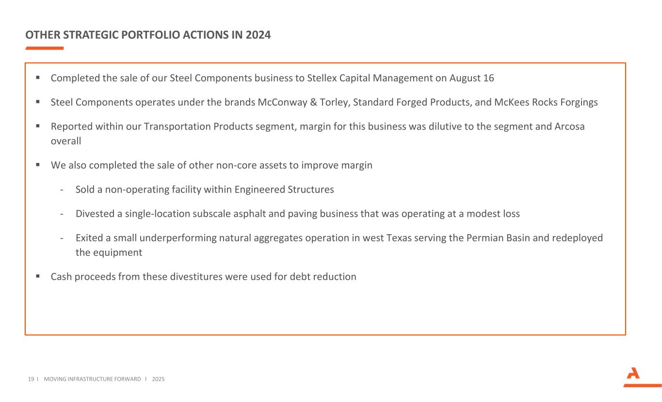 OTHER STRATEGIC PORTFOLIO ACTIONS IN 2024 19 I    MOVING INFRASTRUCTURE FORWARD   I    2025  Completed the sale of our Steel Components business to Stellex Capital Management on August 16  Steel Components operates under the brands McConway & Torley, Standard Forged Products, and McKees Rocks Forgings  Reported within our Transportation Products segment, margin for this business was dilutive to the segment and Arcosa  overall  We also completed the sale of other non-core assets to improve margin - Sold a non-operating facility within Engineered Structures - Divested a single-location subscale asphalt and paving business that was operating at a modest loss - Exited a small underperforming natural aggregates operation in west Texas serving the Permian Basin and redeployed  the equipment  Cash proceeds from these divestitures were used for debt reduction