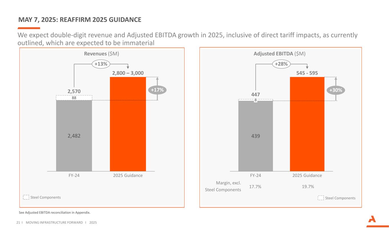 See Adjusted EBITDA reconciliation in Appendix. MAY 7, 2025: REAFFIRM 2025 GUIDANCE 439 8 FY-24 2025 Guidance 447 545 - 595 +30% +28% Adjusted EBITDA ($M) 21 I    MOVING INFRASTRUCTURE FORWARD   I    2025 Margin, excl.  Steel Components 17.7% 2,482 88 FY-24 2025 Guidance 2,570 2,800 – 3,000 +17% +13% Revenues ($M) Steel Components 19.7% Steel Components We expect double-digit revenue and Adjusted EBITDA growth in 2025, inclusive of direct tariff impacts, as currently  outlined, which are expected to be immaterial