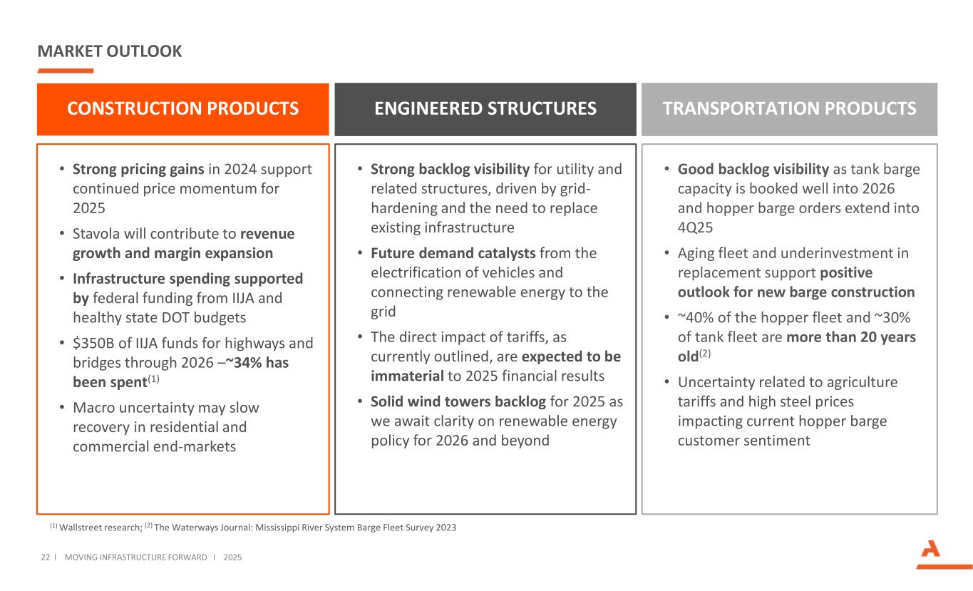 MARKET OUTLOOK CONSTRUCTION PRODUCTS ENGINEERED STRUCTURES TRANSPORTATION PRODUCTS 22 I    MOVING INFRASTRUCTURE FORWARD   I    2025 • Strong pricing gains in 2024 support  continued price momentum for  2025 • Stavola will contribute to revenue  growth and margin expansion • Infrastructure spending supported  by federal funding from IIJA and  healthy state DOT budgets • $350B of IIJA funds for highways and  bridges through 2026 –~34% has  been spent(1) • Macro uncertainty may slow  recovery in residential and  commercial end-markets • Strong backlog visibility for utility and  related structures, driven by grid- hardening and the need to replace  existing infrastructure • Future demand catalysts from the  electrification of vehicles and  connecting renewable energy to the  grid • The direct impact of tariffs, as  currently outlined, are expected to be  immaterial to 2025 financial results • Solid wind towers backlog for 2025 as  we await clarity on renewable energy  policy for 2026 and beyond • Good backlog visibility as tank barge  capacity is booked well into 2026  and hopper barge orders extend into  4Q25 • Aging fleet and underinvestment in  replacement support positive  outlook for new barge construction • ~40% of the hopper fleet and ~30%  of tank fleet are more than 20 years  old(2) • Uncertainty related to agriculture  tariffs and high steel prices  impacting current hopper barge  customer sentiment (1) Wallstreet research; (2) The Waterways Journal: Mississippi River System Barge Fleet Survey 2023