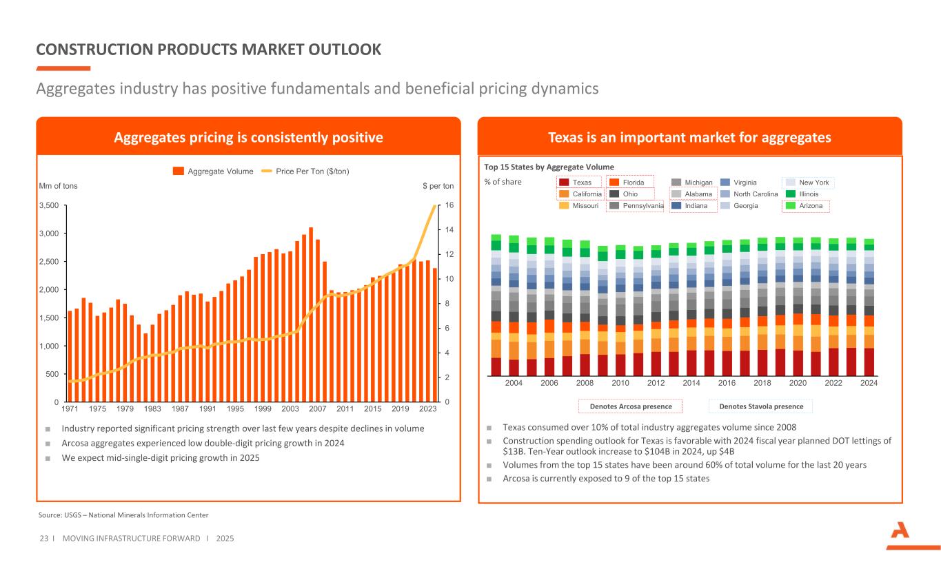 CONSTRUCTION PRODUCTS MARKET OUTLOOK 23 I    MOVING INFRASTRUCTURE FORWARD   I    2025 Source: USGS – National Minerals Information Center Aggregates industry has positive fundamentals and beneficial pricing dynamics Texas is an important market for aggregatesAggregates pricing is consistently positive ■ Industry reported significant pricing strength over last few years despite declines in volume ■ Arcosa aggregates experienced low double-digit pricing growth in 2024 ■ We expect mid-single-digit pricing growth in 2025 Top 15 States by Aggregate Volume ■ Texas consumed over 10% of total industry aggregates volume since 2008 ■ Construction spending outlook for Texas is favorable with 2024 fiscal year planned DOT lettings of  $13B. Ten-Year outlook increase to $104B in 2024, up $4B ■ Volumes from the top 15 states have been around 60% of total volume for the last 20 years  ■ Arcosa is currently exposed to 9 of the top 15 states Denotes Arcosa presence Denotes Stavola presence % of share 0 2 4 6 8 10 12 14 16 0 500 1,000 1,500 2,000 2,500 3,000 3,500 Mm of tons $ per ton 1971 1975 1979 1983 1987 1991 1995 1999 2003 2007 2011 2015 2019 2023 Aggregate Volume Price Per Ton ($/ton) Texas California Missouri Florida Ohio Pennsylvania Michigan Alabama Indiana Virginia North Carolina Georgia New York Illinois Arizona 2004 2006 2008 2010 2012 2014 2016 2018 2020 2022 2024