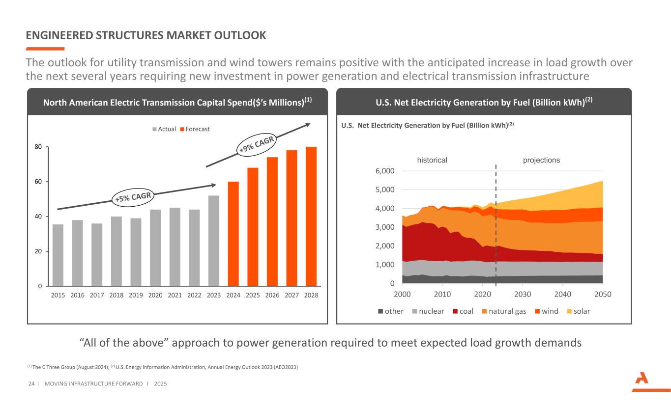 ENGINEERED STRUCTURES MARKET OUTLOOK 24 I    MOVING INFRASTRUCTURE FORWARD   I    2025 (1) The C Three Group (August 2024); (2) U.S. Energy Information Administration, Annual Energy Outlook 2023 (AEO2023) The outlook for utility transmission and wind towers remains positive with the anticipated increase in load growth over  the next several years requiring new investment in power generation and electrical transmission infrastructure U.S. Net Electricity Generation by Fuel (Billion kWh)(2) Total U.S. and Canada Electric Transmission: Reported CAPEX ($B) North American Electric Transmission Capital Spend($’s Millions)(1) Total U.S. and Canada Electric Transmission: Reported CAPEX ($B) 0 20 40 60 80 2015 2016 2017 2018 2019 2020 2021 2022 2023 2024 2025 2026 2027 2028 Actual Forecast U.S.  Net Electricity Generation by Fuel (Billion kWh)(2) 0 1,000 2,000 3,000 4,000 5,000 6,000 2000 2010 2020 2030 2040 2050 other nuclear coal natural gas wind solar historical projections “All of the above” approach to power generation required to meet expected load growth demands