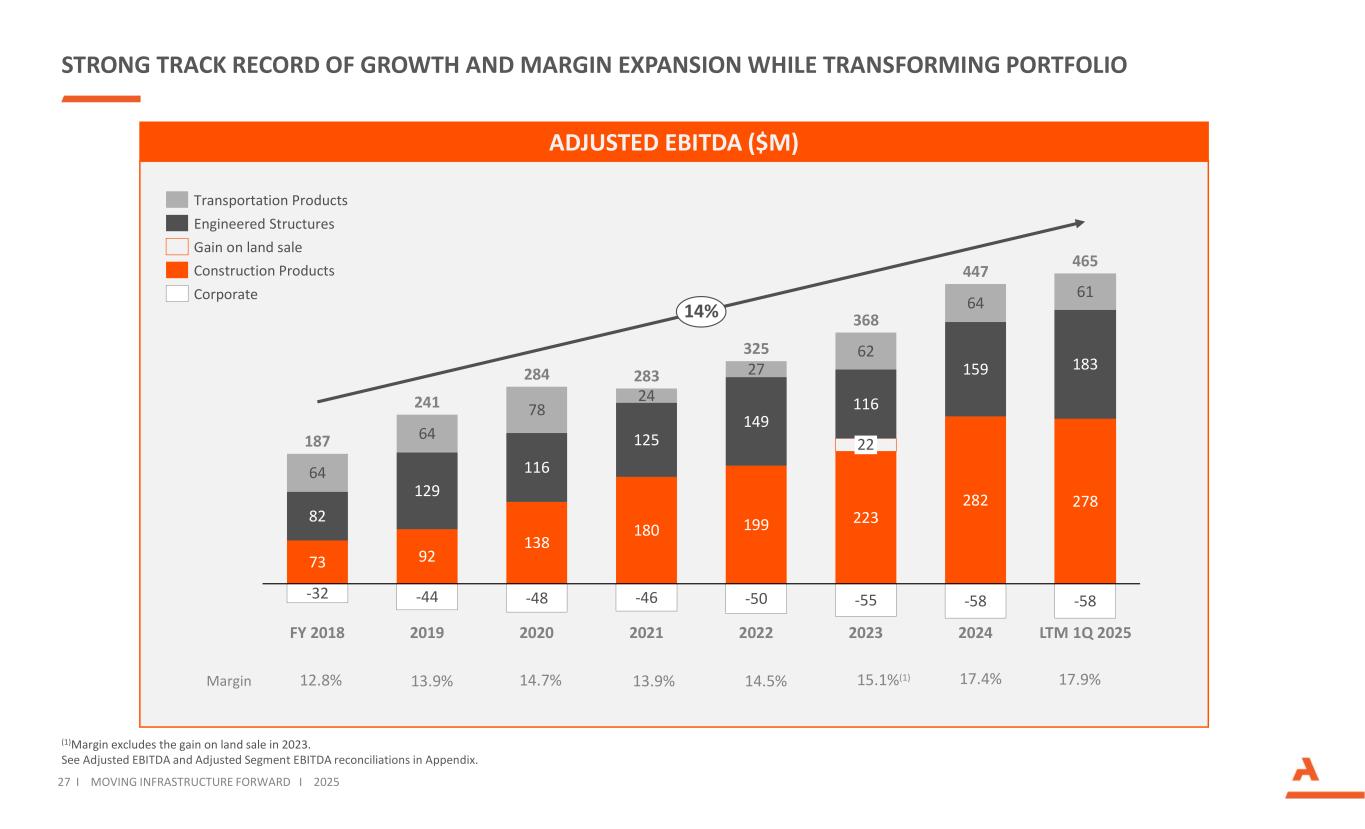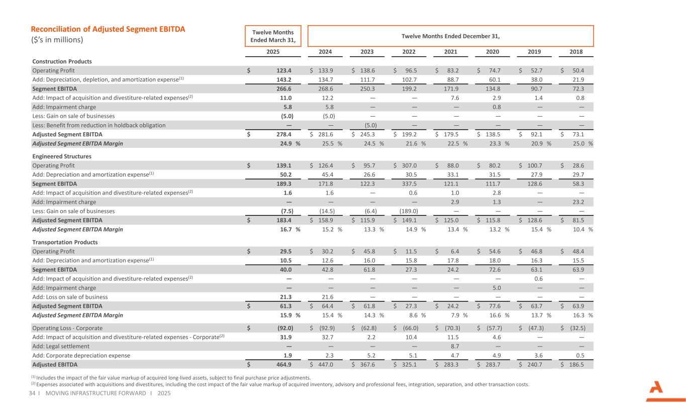 34 Moving Infrastructure ForwardI    MOVING INFRASTRUCTURE FORWARD   I    2025 Reconciliation of Adjusted Segment EBITDA (1) Includes the impact of the fair value markup of acquired long-lived assets, subject to final purchase price adjustments. (2) Expenses associated with acquisitions and divestitures, including the cost impact of the fair value markup of acquired inventory, advisory and professional fees, integration, separation, and other transaction costs. ($’s in millions) (unaudited) Twelve Months Ended December 31,Twelve Months  Ended March 31, 20182019202020212022202320242025 Construction Products $ 50.4$ 52.7$ 74.7$ 83.2$ 96.5$ 138.6$ 133.9$ 123.4Operating Profit 21.938.060.188.7102.7111.7134.7143.2Add: Depreciation, depletion, and amortization expense(1) 72.390.7134.8171.9199.2250.3268.6266.6Segment EBITDA 0.81.42.97.6——12.211.0Add: Impact of acquisition and divestiture-related expenses(2) ——0.8———5.85.8Add: Impairment charge ——————(5.0)(5.0)Less: Gain on sale of businesses —————(5.0)——Less: Benefit from reduction in holdback obligation $ 73.1$ 92.1$ 138.5$ 179.5$ 199.2$ 245.3$ 281.6$ 278.4Adjusted Segment EBITDA 25.0 %20.9 %23.3 %22.5 %21.6 %24.5 %25.5 %24.9 %Adjusted Segment EBITDA Margin Engineered Structures $ 28.6$ 100.7$ 80.2$ 88.0$ 307.0$ 95.7$ 126.4$ 139.1Operating Profit 29.727.931.533.130.526.645.450.2Add: Depreciation and amortization expense(1) 58.3128.6111.7121.1337.5122.3171.8189.3Segment EBITDA ——2.81.00.6—1.61.6Add: Impact of acquisition and divestiture-related expenses(2) 23.2—1.32.9————Add: Impairment charge ————(189.0)(6.4)(14.5)(7.5)Less: Gain on sale of businesses $ 81.5$ 128.6$ 115.8$ 125.0$ 149.1$ 115.9$ 158.9$ 183.4Adjusted Segment EBITDA 10.4 %15.4 %13.2 %13.4 %14.9 %13.3 %15.2 %16.7 %Adjusted Segment EBITDA Margin Transportation Products $ 48.4$ 46.8$ 54.6$ 6.4$ 11.5$ 45.8$ 30.2$ 29.5Operating Profit 15.516.318.017.815.816.012.610.5Add: Depreciation and amortization expense(1) 63.963.172.624.227.361.842.840.0Segment EBITDA —0.6——————Add: Impact of acquisition and divestiture-related expenses(2) ——5.0—————Add: Impairment charge ——————21.621.3Add: Loss on sale of business $ 63.9$ 63.7$ 77.6$ 24.2$ 27.3$ 61.8$ 64.4$ 61.3Adjusted Segment EBITDA 16.3 %13.7 %16.6 %7.9 %8.6 %14.3 %15.4 %15.9 %Adjusted Segment EBITDA Margin $ (32.5)$ (47.3)$ (57.7)$ (70.3)$ (66.0)$ (62.8)$ (92.9)$ (92.0)Operating Loss - Corporate ——4.611.510.42.232.731.9Add: Impact of acquisition and divestiture-related expenses - Corporate(2) ———8.7————Add: Legal settlement 0.53.64.94.75.15.22.31.9Add: Corporate depreciation expense $ 186.5$ 240.7$ 283.7$ 283.3$ 325.1$ 367.6$ 447.0$ 464.9Adjusted EBITDA