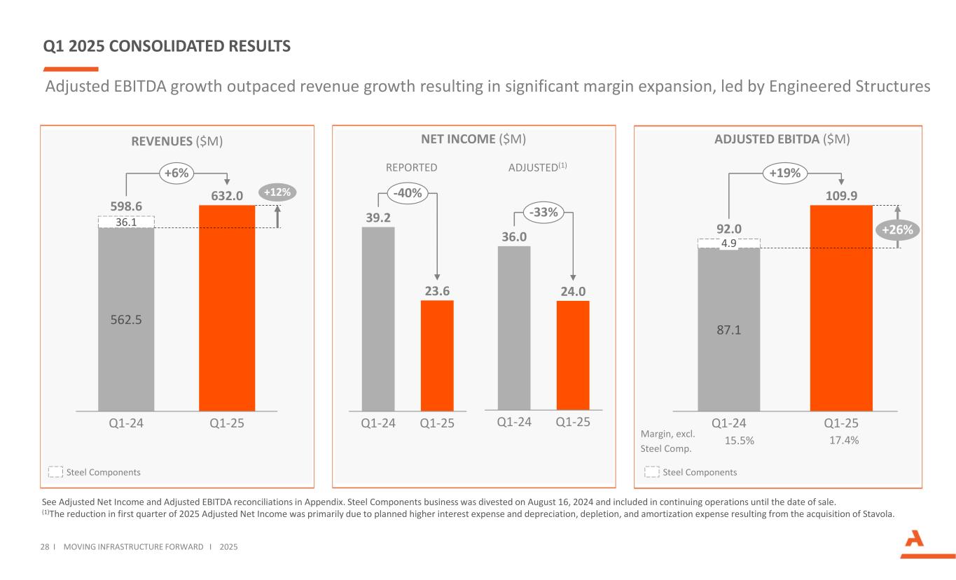 Q1 2025 CONSOLIDATED RESULTS 28 I    MOVING INFRASTRUCTURE FORWARD   I    2025 Adjusted EBITDA growth outpaced revenue growth resulting in significant margin expansion, led by Engineered Structures See Adjusted Net Income and Adjusted EBITDA reconciliations in Appendix. Steel Components business was divested on August 16, 2024 and included in continuing operations until the date of sale. (1)The reduction in first quarter of 2025 Adjusted Net Income was primarily due to planned higher interest expense and depreciation, depletion, and amortization expense resulting from the acquisition of Stavola. REVENUES ($M) ADJUSTED EBITDA ($M) Margin, excl.  Steel Comp.  15.5% 17.4% REPORTED ADJUSTED(1) NET INCOME ($M) 39.2 23.6 Q1-24 Q1-25 -40% 36.0 24.0 Q1-24 Q1-25 -33% 562.5 632.0 36.1 Q1-24 Q1-25 598.6 +12% +6% Steel Components 87.1 109.9 4.9 Q1-24 Q1-25 92.0 +26% +19% Steel Components