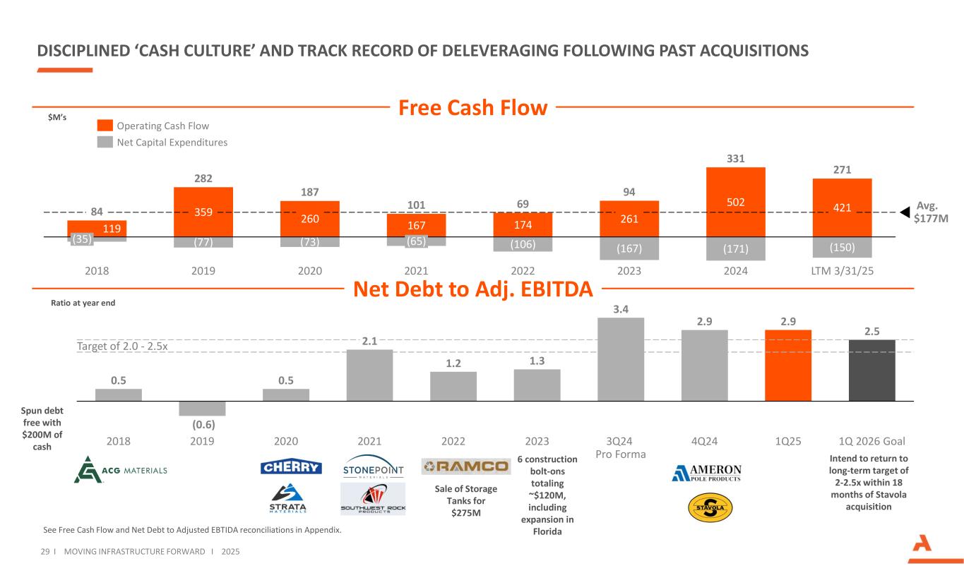 29 I    MOVING INFRASTRUCTURE FORWARD   I    2025 $M’s Ratio at year end Spun debt  free with  $200M of  cash Sale of Storage  Tanks for  $275M 6 construction  bolt-ons  totaling  ~$120M,  including  expansion in  Florida DISCIPLINED ‘CASH CULTURE’ AND TRACK RECORD OF DELEVERAGING FOLLOWING PAST ACQUISITIONS Free Cash Flow Net Debt to Adj. EBITDA See Free Cash Flow and Net Debt to Adjusted EBTIDA reconciliations in Appendix. 119  359 260 167 174 261  502 421  (77) (73) (106) (167) (171) (150) (35) 2018 2019 2020 (65) 2021 2022 2023 2024 LTM 3/31/25 Avg. $177M84 282 187 101 69 94 331 271 Operating Cash Flow Net Capital Expenditures 0.5  (0.6) 0.5 2.1 1.2 1.3 3.4 2.9 2.9 2.5 2018 2019 2020 2021 2022 2023 3Q24  Pro Forma 4Q24 1Q25 1Q 2026 Goal Intend to return to  long-term target of  2-2.5x within 18  months of Stavola  acquisition Target of 2.0 - 2.5x