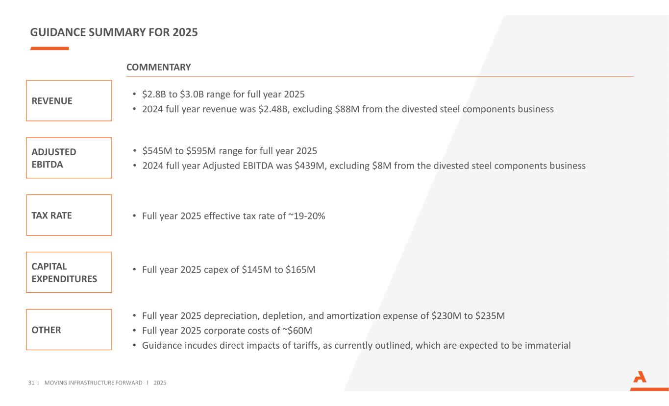 GUIDANCE SUMMARY FOR 2025 ADJUSTED  EBITDA COMMENTARY CAPITAL  EXPENDITURES OTHER • $545M to $595M range for full year 2025 • 2024 full year Adjusted EBITDA was $439M, excluding $8M from the divested steel components business • Full year 2025 capex of $145M to $165M TAX RATE • Full year 2025 effective tax rate of ~19-20% REVENUE • $2.8B to $3.0B range for full year 2025 • 2024 full year revenue was $2.48B, excluding $88M from the divested steel components business 31 I    MOVING INFRASTRUCTURE FORWARD   I    2025 • Full year 2025 depreciation, depletion, and amortization expense of $230M to $235M • Full year 2025 corporate costs of ~$60M • Guidance incudes direct impacts of tariffs, as currently outlined, which are expected to be immaterial