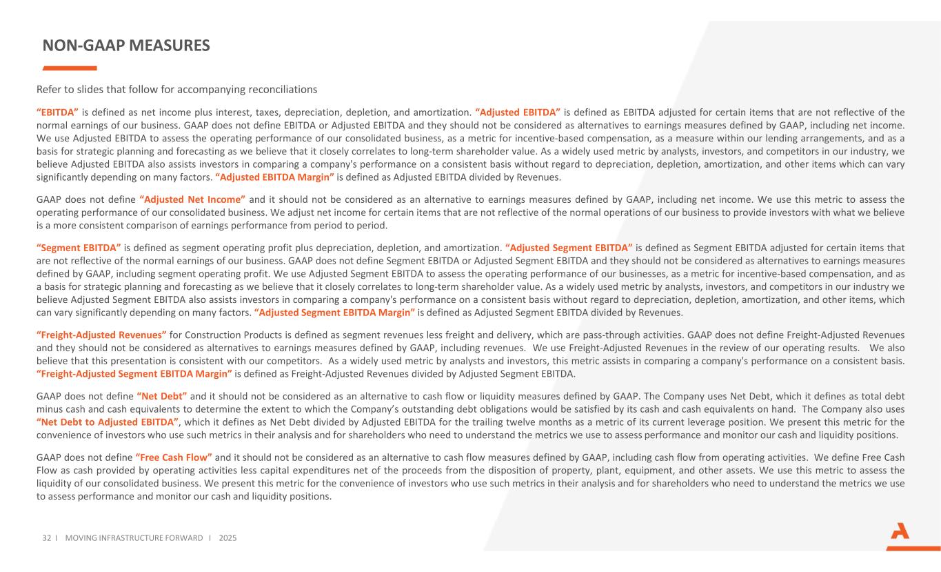 NON-GAAP MEASURES Refer to slides that follow for accompanying reconciliations “EBITDA” is defined as net income plus interest, taxes, depreciation, depletion, and amortization. “Adjusted EBITDA” is defined as EBITDA adjusted for certain items that are not reflective of the normal earnings of our business. GAAP does not define EBITDA or Adjusted EBITDA and they should not be considered as alternatives to earnings measures defined by GAAP, including net income. We use Adjusted EBITDA to assess the operating performance of our consolidated business, as a metric for incentive-based compensation, as a measure within our lending arrangements, and as a basis for strategic planning and forecasting as we believe that it closely correlates to long-term shareholder value. As a widely used metric by analysts, investors, and competitors in our industry, we believe Adjusted EBITDA also assists investors in comparing a company's performance on a consistent basis without regard to depreciation, depletion, amortization, and other items which can vary significantly depending on many factors. “Adjusted EBITDA Margin” is defined as Adjusted EBITDA divided by Revenues. GAAP does not define “Adjusted Net Income” and it should not be considered as an alternative to earnings measures defined by GAAP, including net income. We use this metric to assess the operating performance of our consolidated business. We adjust net income for certain items that are not reflective of the normal operations of our business to provide investors with what we believe is a more consistent comparison of earnings performance from period to period. “Segment EBITDA” is defined as segment operating profit plus depreciation, depletion, and amortization. “Adjusted Segment EBITDA” is defined as Segment EBITDA adjusted for certain items that are not reflective of the normal earnings of our business. GAAP does not define Segment EBITDA or Adjusted Segment EBITDA and they should not be considered as alternatives to earnings measures defined by GAAP, including segment operating profit. We use Adjusted Segment EBITDA to assess the operating performance of our businesses, as a metric for incentive-based compensation, and as a basis for strategic planning and forecasting as we believe that it closely correlates to long-term shareholder value. As a widely used metric by analysts, investors, and competitors in our industry we believe Adjusted Segment EBITDA also assists investors in comparing a company's performance on a consistent basis without regard to depreciation, depletion, amortization, and other items, which can vary significantly depending on many factors. “Adjusted Segment EBITDA Margin” is defined as Adjusted Segment EBITDA divided by Revenues. “Freight-Adjusted Revenues” for Construction Products is defined as segment revenues less freight and delivery, which are pass-through activities. GAAP does not define Freight-Adjusted Revenues and they should not be considered as alternatives to earnings measures defined by GAAP, including revenues. We use Freight-Adjusted Revenues in the review of our operating results. We also believe that this presentation is consistent with our competitors. As a widely used metric by analysts and investors, this metric assists in comparing a company's performance on a consistent basis. “Freight-Adjusted Segment EBITDA Margin” is defined as Freight-Adjusted Revenues divided by Adjusted Segment EBITDA. GAAP does not define “Net Debt” and it should not be considered as an alternative to cash flow or liquidity measures defined by GAAP. The Company uses Net Debt, which it defines as total debt minus cash and cash equivalents to determine the extent to which the Company’s outstanding debt obligations would be satisfied by its cash and cash equivalents on hand. The Company also uses “Net Debt to Adjusted EBITDA”, which it defines as Net Debt divided by Adjusted EBITDA for the trailing twelve months as a metric of its current leverage position. We present this metric for the convenience of investors who use such metrics in their analysis and for shareholders who need to understand the metrics we use to assess performance and monitor our cash and liquidity positions. GAAP does not define “Free Cash Flow” and it should not be considered as an alternative to cash flow measures defined by GAAP, including cash flow from operating activities. We define Free Cash Flow as cash provided by operating activities less capital expenditures net of the proceeds from the disposition of property, plant, equipment, and other assets. We use this metric to assess the liquidity of our consolidated business. We present this metric for the convenience of investors who use such metrics in their analysis and for shareholders who need to understand the metrics we use to assess performance and monitor our cash and liquidity positions. 32 I    MOVING INFRASTRUCTURE FORWARD   I    2025