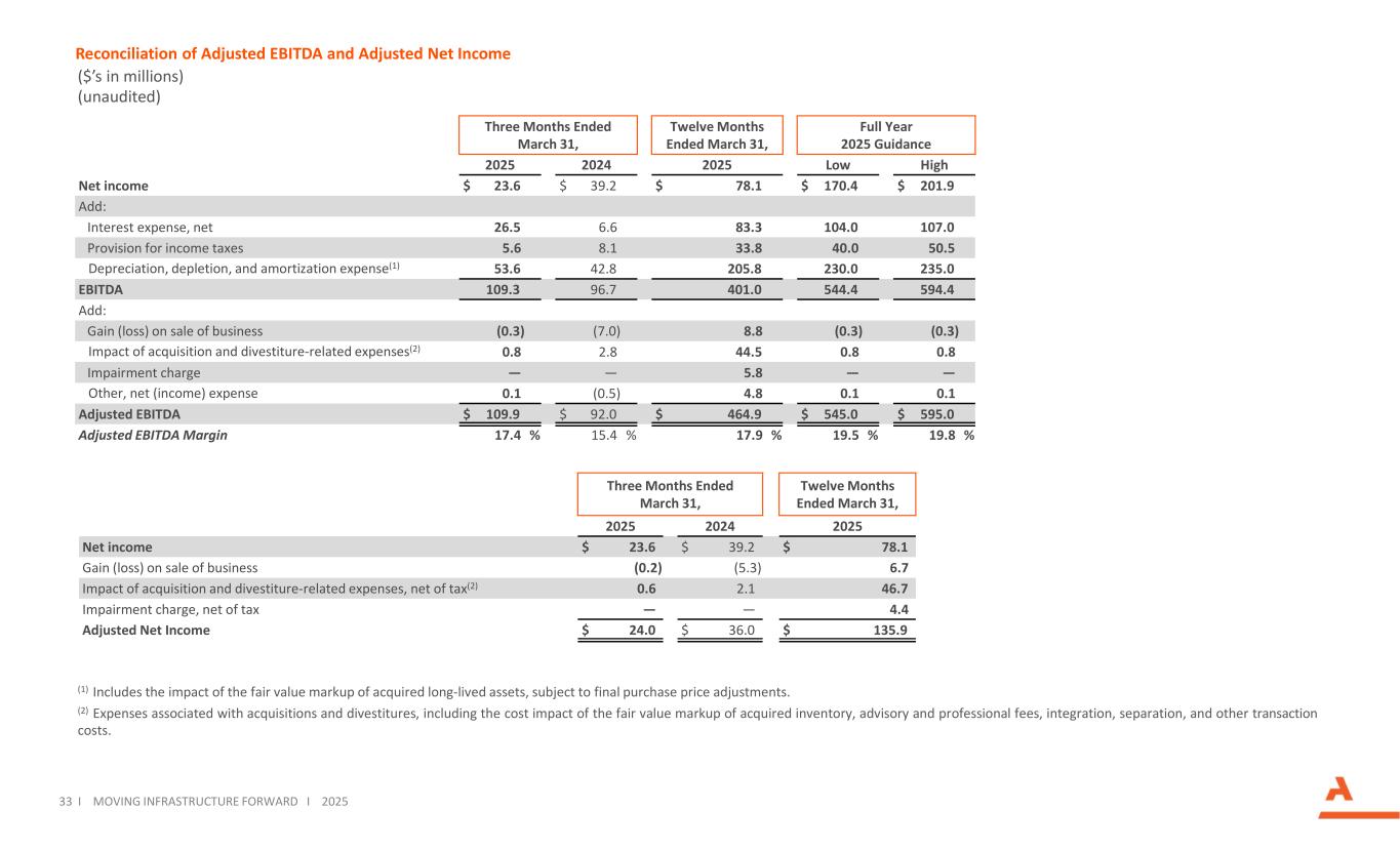 Reconciliation of Adjusted EBITDA and Adjusted Net Income 33 Moving Infrastructure Forward (1) Includes the impact of the fair value markup of acquired long-lived assets, subject to final purchase price adjustments. (2) Expenses associated with acquisitions and divestitures, including the cost impact of the fair value markup of acquired inventory, advisory and professional fees, integration, separation, and other transaction costs. ($’s in millions) (unaudited) I    MOVING INFRASTRUCTURE FORWARD   I    2025 Full Year  2025 Guidance Twelve Months  Ended March 31, Three Months Ended March 31, HighLow202520242025 $ 201.9$ 170.4$ 78.1$ 39.2$ 23.6Net income Add: 107.0104.083.36.626.5Interest expense, net 50.540.033.88.15.6Provision for income taxes 235.0230.0205.842.853.6Depreciation, depletion, and amortization expense(1) 594.4544.4401.096.7109.3EBITDA Add: (0.3)(0.3)8.8(7.0)(0.3)Gain (loss) on sale of business 0.80.844.52.80.8Impact of acquisition and divestiture-related expenses(2)  ——5.8——Impairment charge 0.10.14.8(0.5)0.1Other, net (income) expense $ 595.0$ 545.0$ 464.9$ 92.0$ 109.9Adjusted EBITDA 19.8 %19.5 %17.9 %15.4 %17.4 %Adjusted EBITDA Margin Twelve Months  Ended March 31, Three Months Ended March 31, 202520242025 $ 78.1$ 39.2$ 23.6Net income 6.7(5.3)(0.2)Gain (loss) on sale of business 46.72.10.6Impact of acquisition and divestiture-related expenses, net of tax(2) 4.4——Impairment charge, net of tax $ 135.9$ 36.0$ 24.0Adjusted Net Income