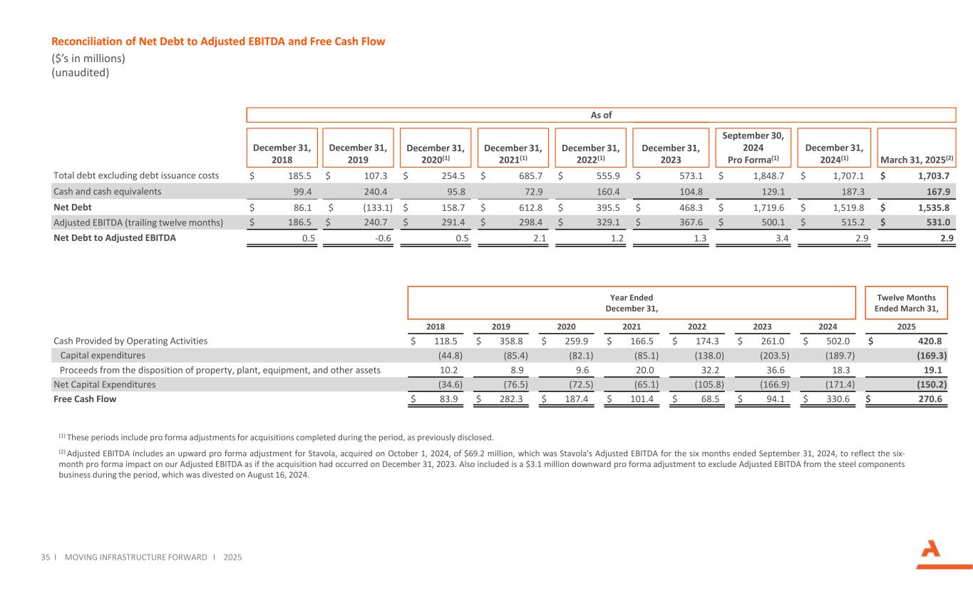35 Moving Infrastructure ForwardI    MOVING INFRASTRUCTURE FORWARD   I    2025 Reconciliation of Net Debt to Adjusted EBITDA and Free Cash Flow ($’s in millions) (unaudited) (1) These periods include pro forma adjustments for acquisitions completed during the period, as previously disclosed. (2) Adjusted EBITDA includes an upward pro forma adjustment for Stavola, acquired on October 1, 2024, of $69.2 million, which was Stavola's Adjusted EBITDA for the six months ended September 31, 2024, to reflect the six- month pro forma impact on our Adjusted EBITDA as if the acquisition had occurred on December 31, 2023. Also included is a $3.1 million downward pro forma adjustment to exclude Adjusted EBITDA from the steel components business during the period, which was divested on August 16, 2024. As of March 31, 2025(2) December 31,  2024(1) September 30,  2024 Pro Forma(1) December 31,  2023 December 31,  2022(1) December 31,  2021(1) December 31,  2020(1) December 31,  2019 December 31,  2018 $ 1,703.7$ 1,707.1$ 1,848.7$ 573.1$ 555.9$ 685.7$ 254.5$ 107.3$ 185.5Total debt excluding debt issuance costs 167.9187.3129.1104.8160.472.995.8240.499.4Cash and cash equivalents $ 1,535.8$ 1,519.8$ 1,719.6$ 468.3$ 395.5$ 612.8$ 158.7$ (133.1)$ 86.1Net Debt $ 531.0$ 515.2$ 500.1$ 367.6$ 329.1$ 298.4$ 291.4$ 240.7$ 186.5Adjusted EBITDA (trailing twelve months) 2.92.93.41.31.22.10.5-0.60.5Net Debt to Adjusted EBITDA Twelve Months  Ended March 31, Year Ended December 31, 20252024202320222021202020192018 $ 420.8$ 502.0$ 261.0$ 174.3$ 166.5$ 259.9$ 358.8$ 118.5Cash Provided by Operating Activities (169.3)(189.7)(203.5)(138.0)(85.1)(82.1)(85.4)(44.8)Capital expenditures 19.118.336.632.220.09.68.910.2Proceeds from the disposition of property, plant, equipment, and other assets (150.2)(171.4)(166.9)(105.8)(65.1)(72.5)(76.5)(34.6)Net Capital Expenditures $ 270.6$ 330.6$ 94.1$ 68.5$ 101.4$ 187.4$ 282.3$ 83.9Free Cash Flow