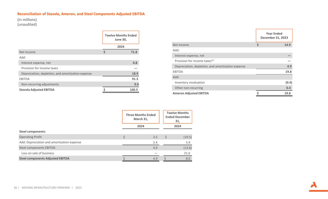 36 Moving Infrastructure ForwardI    MOVING INFRASTRUCTURE FORWARD   I    2025 Reconciliation of Stavola, Ameron, and Steel Components Adjusted EBITDA (in millions) (unaudited) Twelve Months Ended June 30, 2024 $ 71.8Net Income Add: 0.8Interest expense, net —Provision for income taxes 18.9Depreciation, depletion, and amortization expense 91.5EBITDA 9.0 Non-recurring adjustments $ 100.5Stavola Adjusted EBITDA Year Ended December 31, 2023 $ 14.9Net Income Add: —Interest expense, net —Provision for income taxes(1) 4.9Depreciation, depletion, and amortization expense 19.8EBITDA Add: (0.4)Inventory revaluation 0.4Other non-recurring $ 19.8Ameron Adjusted EBITDA Twelve Months  Ended December  31, Three Months Ended March 31, 20242024 Steel components: $ (19.5)$ 2.5Operating Profit 5.92.4Add: Depreciation and amortization expense (13.6)4.9Steel components EBITDA 21.6—Loss on sale of business $ 8.0$ 4.9Steel components Adjusted EBITDA