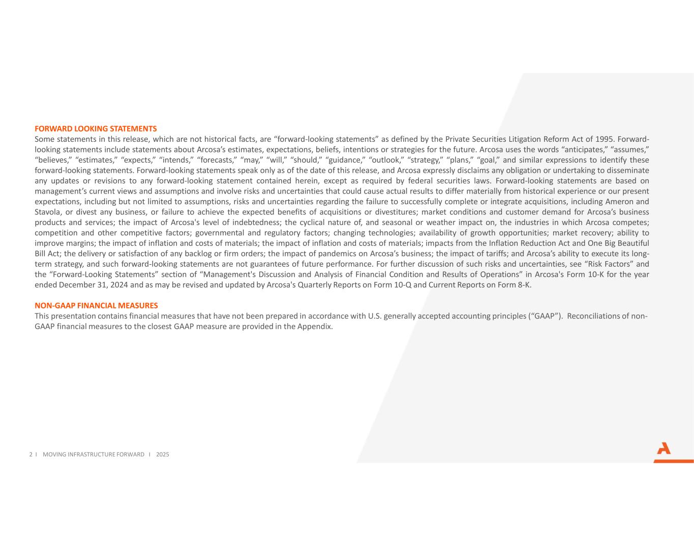 2 I MOVING INFRASTRUCTURE FORWARD I 2025 FORWARD LOOKING STATEMENTS Some statements in this release, which are not historical facts, are “forward-looking statements” as defined by the Private Securities Litigation Reform Act of 1995. Forward- looking statements include statements about Arcosa’s estimates, expectations, beliefs, intentions or strategies for the future. Arcosa uses the words “anticipates,” “assumes,” “believes,” “estimates,” “expects,” “intends,” “forecasts,” “may,” “will,” “should,” “guidance,” “outlook,” “strategy,” “plans,” “goal,” and similar expressions to identify these forward-looking statements. Forward-looking statements speak only as of the date of this release, and Arcosa expressly disclaims any obligation or undertaking to disseminate any updates or revisions to any forward-looking statement contained herein, except as required by federal securities laws. Forward-looking statements are based on management’s current views and assumptions and involve risks and uncertainties that could cause actual results to differ materially from historical experience or our present expectations, including but not limited to assumptions, risks and uncertainties regarding the failure to successfully complete or integrate acquisitions, including Ameron and Stavola, or divest any business, or failure to achieve the expected benefits of acquisitions or divestitures; market conditions and customer demand for Arcosa’s business products and services; the impact of Arcosa's level of indebtedness; the cyclical nature of, and seasonal or weather impact on, the industries in which Arcosa competes; competition and other competitive factors; governmental and regulatory factors; changing technologies; availability of growth opportunities; market recovery; ability to improve margins; the impact of inflation and costs of materials; the impact of inflation and costs of materials; impacts from the Inflation Reduction Act and One Big Beautiful Bill Act; the delivery or satisfaction of any backlog or firm orders; the impact of pandemics on Arcosa’s business; the impact of tariffs; and Arcosa’s ability to execute its long- term strategy, and such forward-looking statements are not guarantees of future performance. For further discussion of such risks and uncertainties, see “Risk Factors” and the “Forward-Looking Statements” section of “Management's Discussion and Analysis of Financial Condition and Results of Operations” in Arcosa's Form 10-K for the year ended December 31, 2024 and as may be revised and updated by Arcosa's Quarterly Reports on Form 10-Q and Current Reports on Form 8-K. NON-GAAP FINANCIAL MEASURES This presentation contains financial measures that have not been prepared in accordance with U.S. generally accepted accounting principles (“GAAP”). Reconciliations of non- GAAP financial measures to the closest GAAP measure are provided in the Appendix.