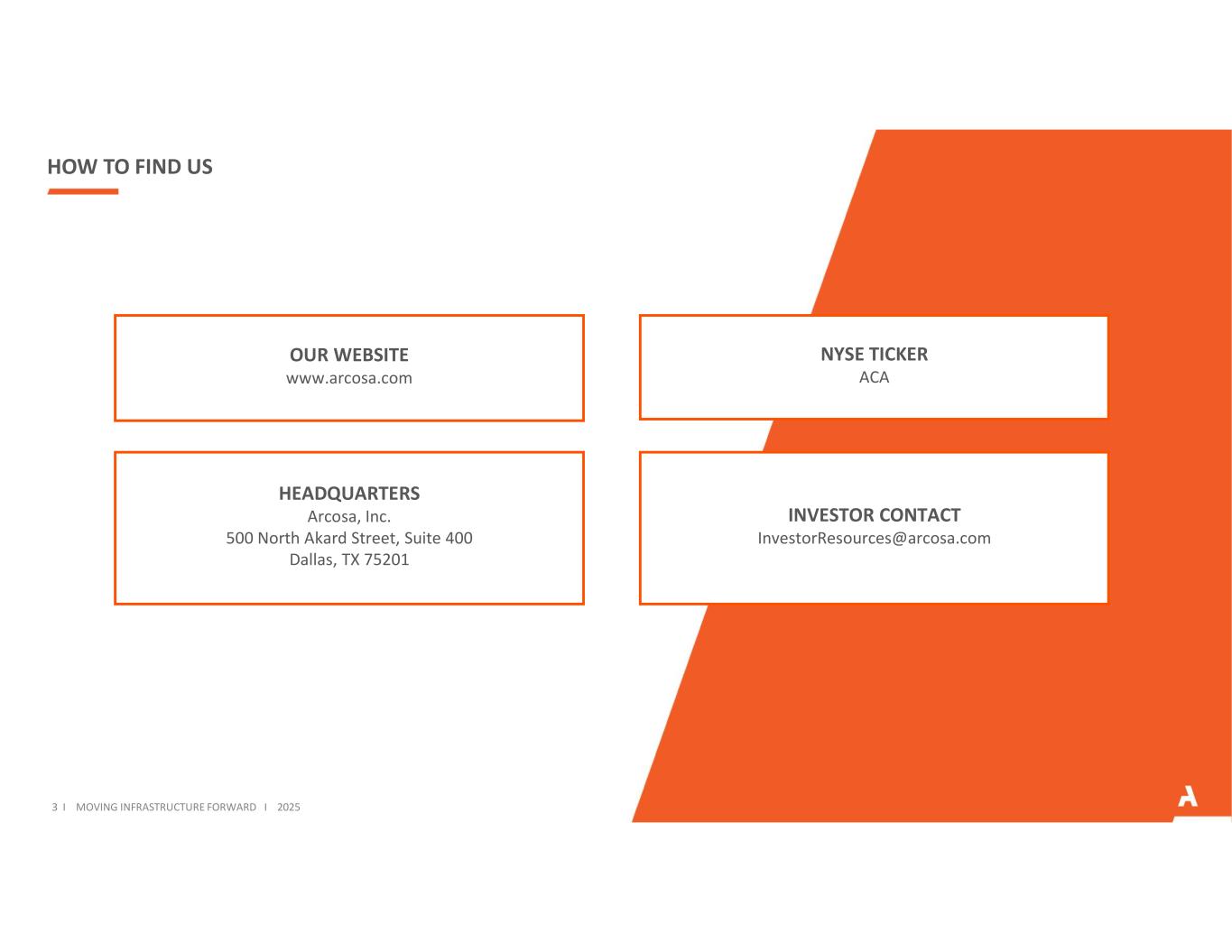 HOW TO FIND US OUR WEBSITE www.arcosa.com NYSE TICKER ACA HEADQUARTERS Arcosa, Inc. 500 North Akard Street, Suite 400 Dallas, TX 75201 INVESTOR CONTACT InvestorResources@arcosa.com 3 I MOVING INFRASTRUCTURE FORWARD I 2025