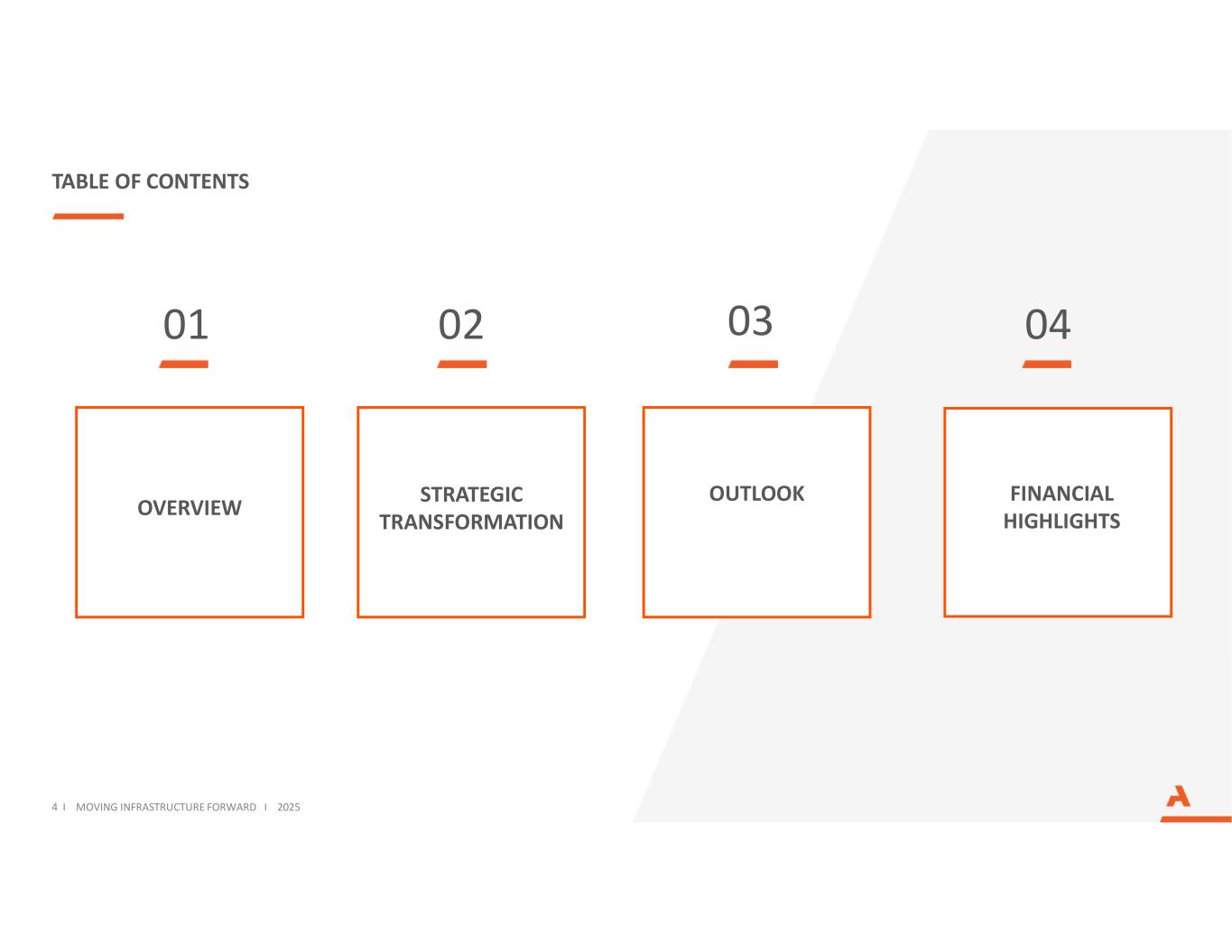 01 03 04 OVERVIEW FINANCIAL HIGHLIGHTS 02 OUTLOOK TABLE OF CONTENTS 4 I MOVING INFRASTRUCTURE FORWARD I 2025 STRATEGIC TRANSFORMATION