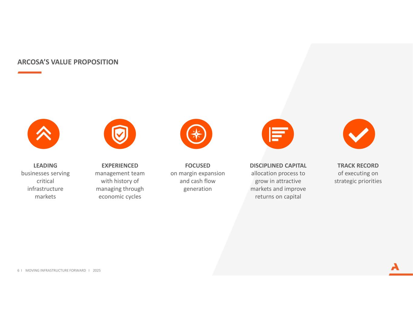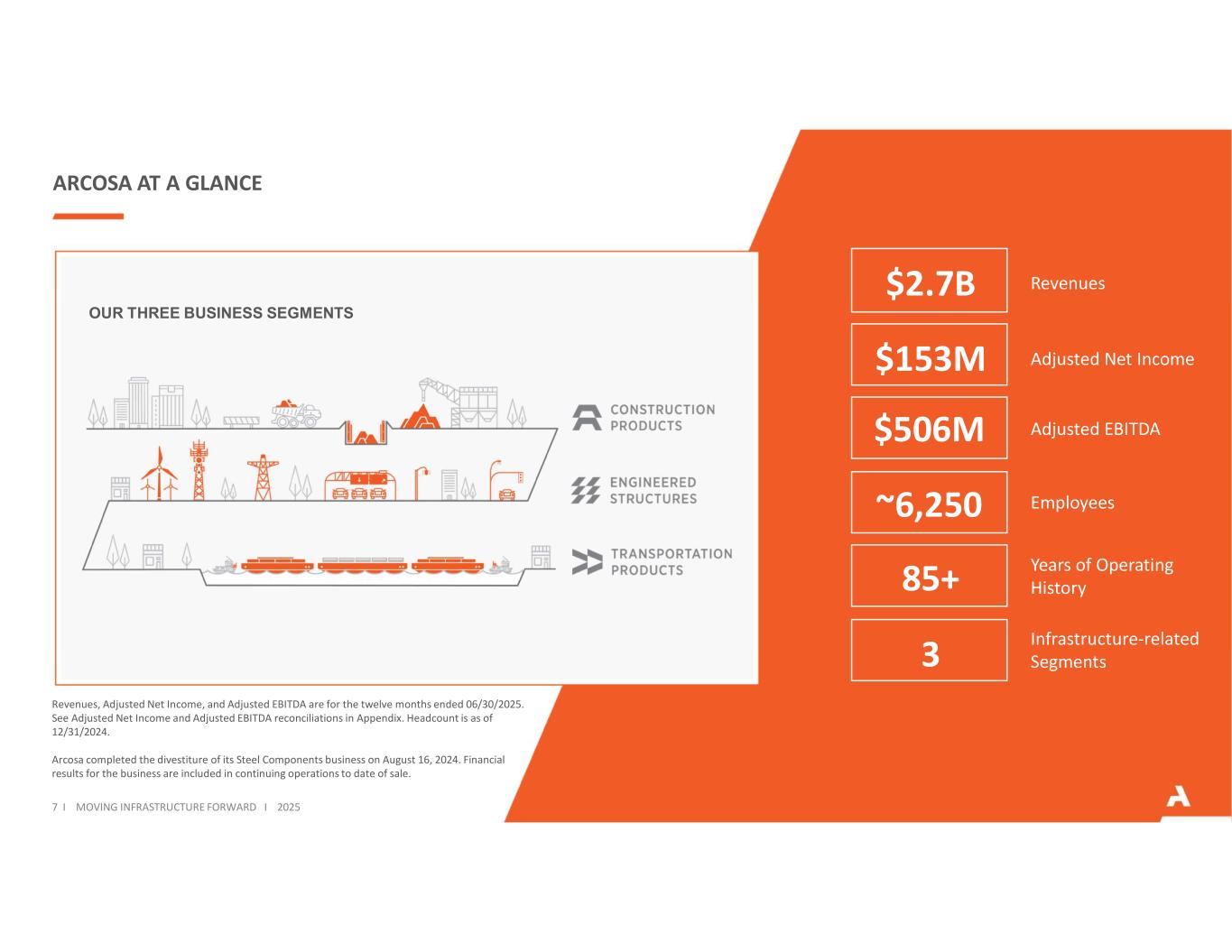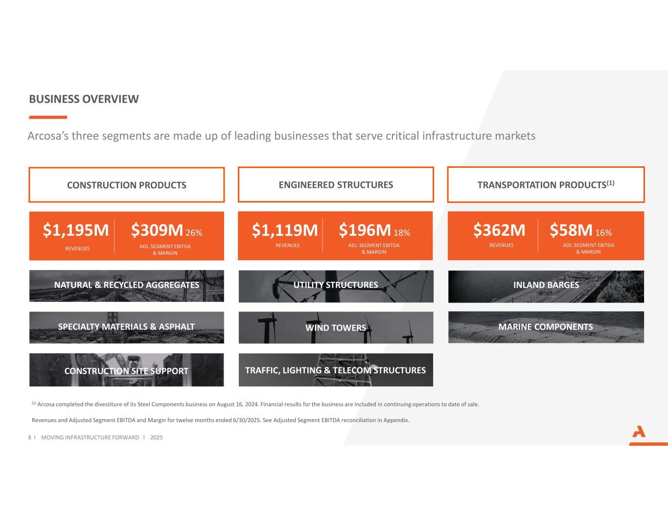 ARCOSA AT A GLANCE Revenues, Adjusted Net Income, and Adjusted EBITDA are for the twelve months ended 06/30/2025. See Adjusted Net Income and Adjusted EBITDA reconciliations in Appendix. Headcount is as of 12/31/2024. Arcosa completed the divestiture of its Steel Components business on August 16, 2024. Financial results for the business are included in continuing operations to date of sale. Adjusted Net Income Adjusted EBITDA Infrastructure-related Segments Employees Years of Operating History OUR THREE BUSINESS SEGMENTS Revenues$2.7B $153M $506M ~6,250 85+ 3 7 I MOVING INFRASTRUCTURE FORWARD I 2025