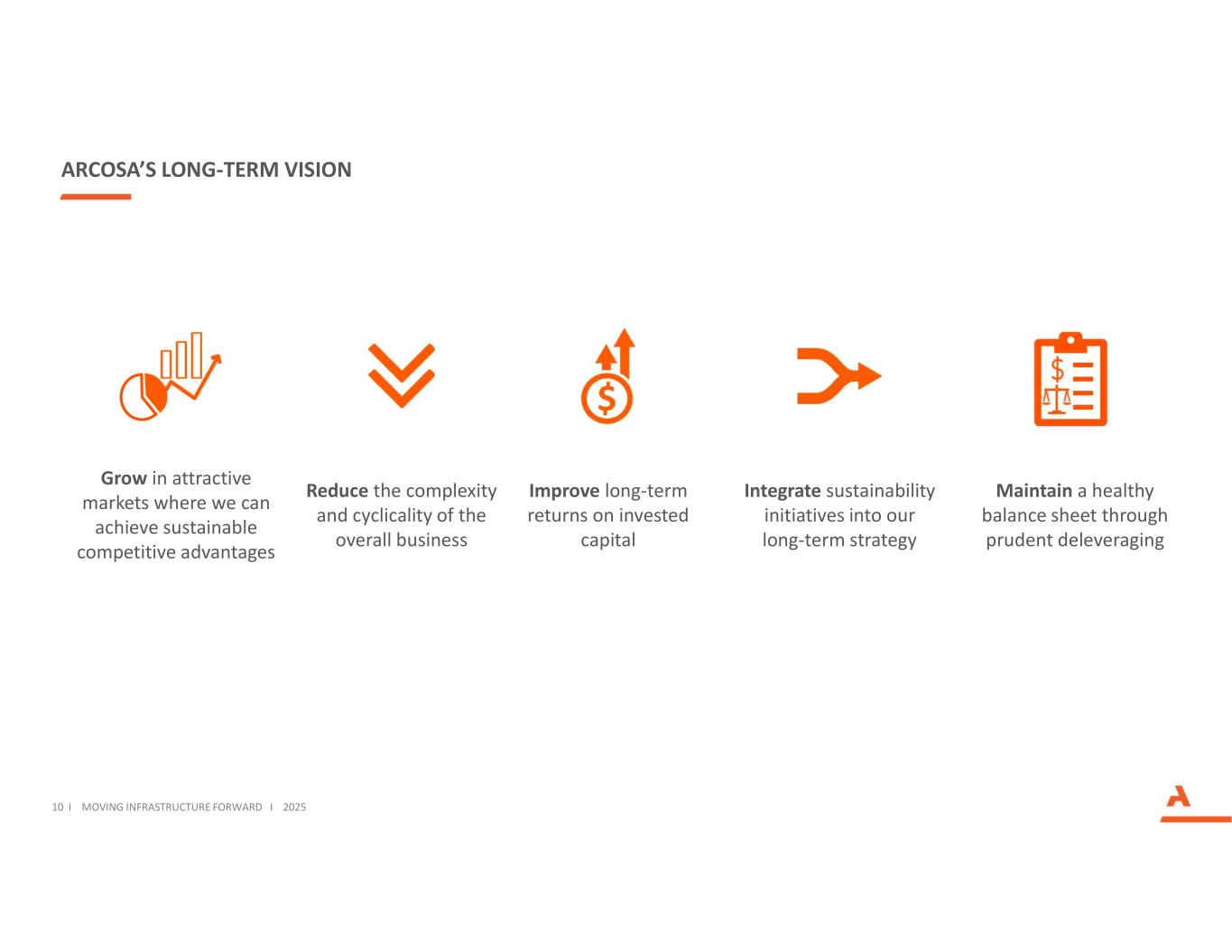 BUSINESS OVERVIEW ENGINEERED STRUCTURES TRANSPORTATION PRODUCTS(1)CONSTRUCTION PRODUCTS (1) Arcosa completed the divestiture of its Steel Components business on August 16, 2024. Financial results for the business are included in continuing operations to date of sale. Revenues and Adjusted Segment EBITDA and Margin for twelve months ended 6/30/2025. See Adjusted Segment EBITDA reconciliation in Appendix. NATURAL & RECYCLED AGGREGATES SPECIALTY MATERIALS & ASPHALT CONSTRUCTION SITE SUPPORT WIND TOWERS UTILITY STRUCTURES INLAND BARGES Arcosa’s three segments are made up of leading businesses that serve critical infrastructure markets REVENUES ADJ. SEGMENT EBITDA & MARGIN $1,195M $1,119M $362M $309M 26% $196M 18% $58M 16% REVENUES ADJ. SEGMENT EBITDA & MARGIN REVENUES ADJ. SEGMENT EBITDA & MARGIN MARINE COMPONENTS 8 I MOVING INFRASTRUCTURE FORWARD I 2025 TRAFFIC, LIGHTING & TELECOM STRUCTURES
