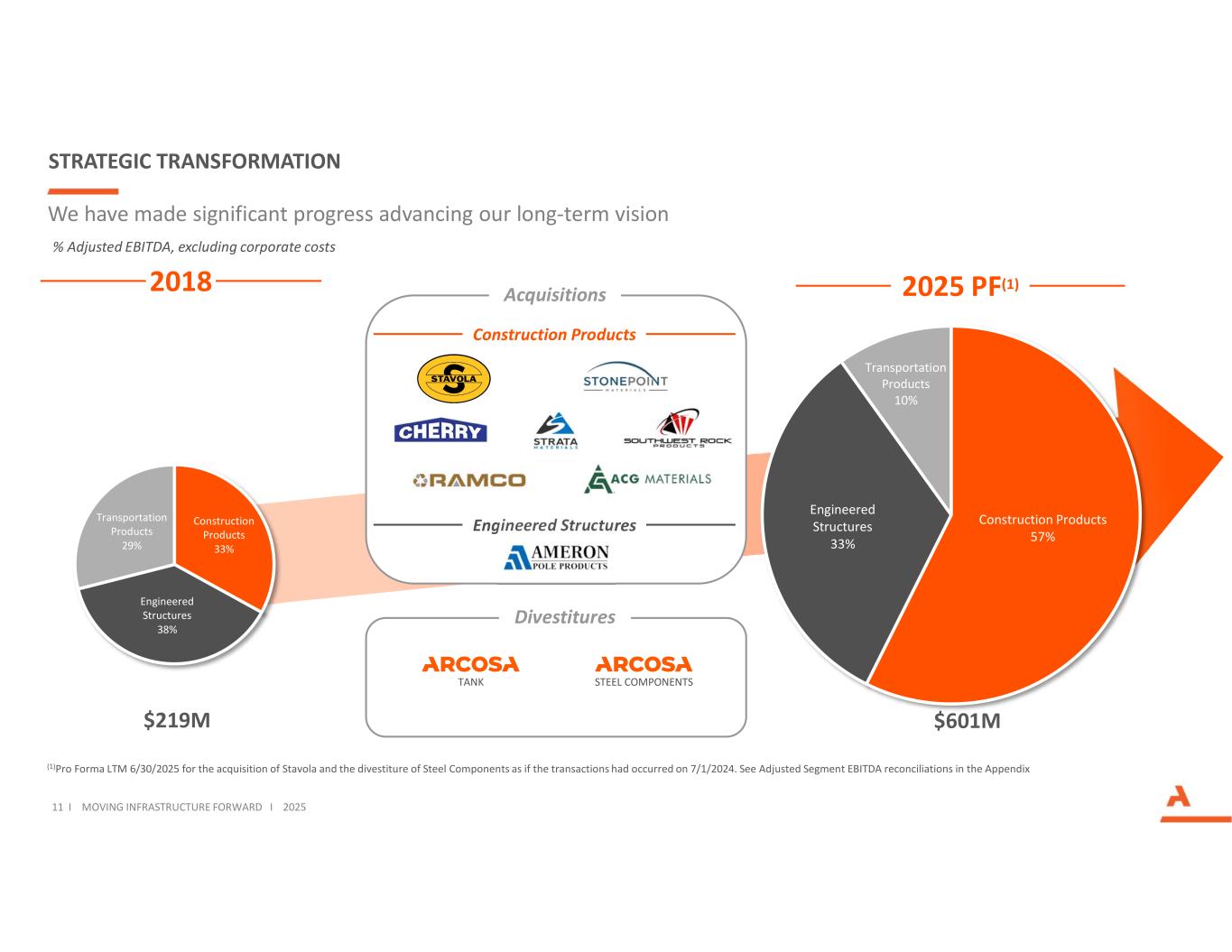 10 I MOVING INFRASTRUCTURE FORWARD I 2025 ARCOSA’S LONG-TERM VISION Reduce the complexity and cyclicality of the overall business Integrate sustainability initiatives into our long-term strategy Improve long-term returns on invested capital Grow in attractive markets where we can achieve sustainable competitive advantages Maintain a healthy balance sheet through prudent deleveraging