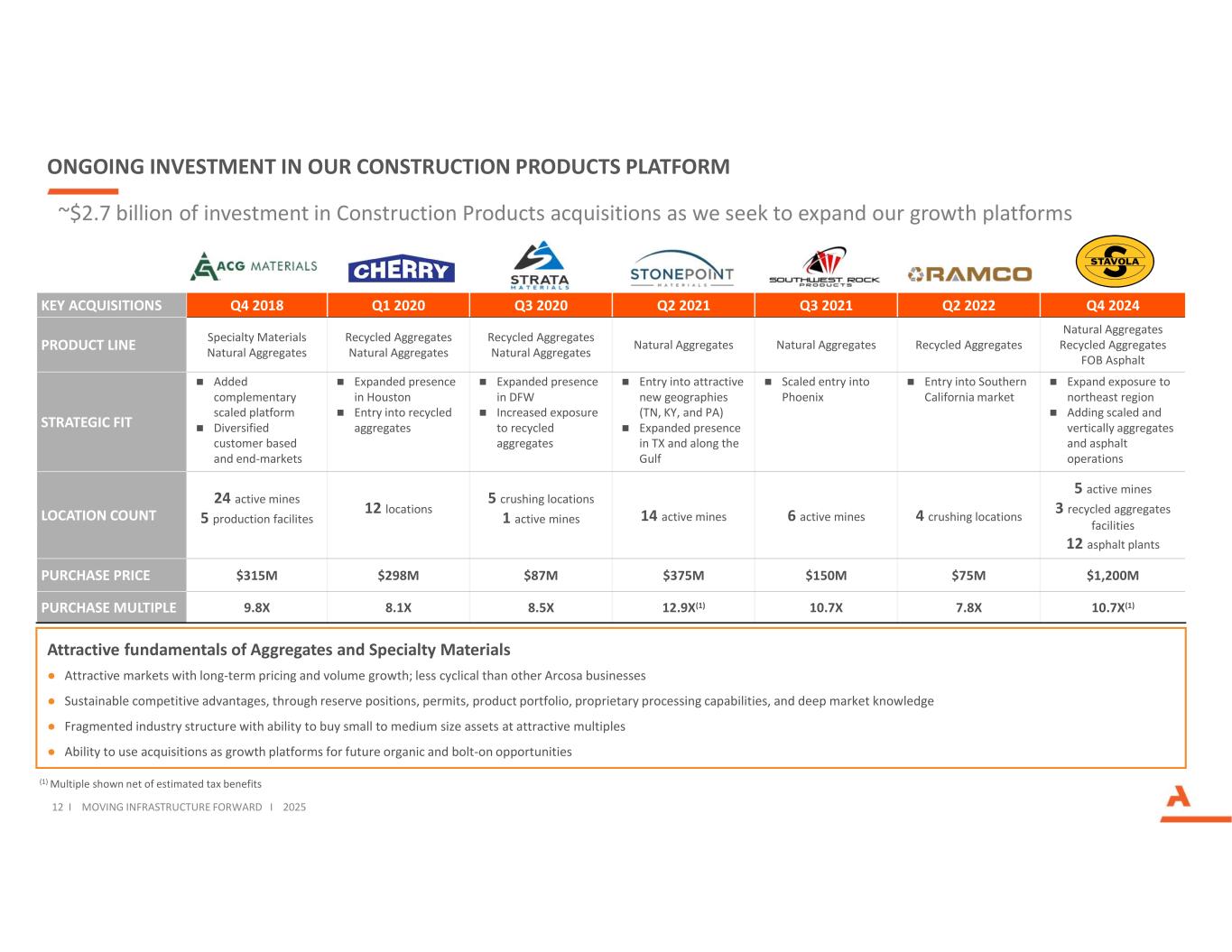 Construction Products 33% Engineered Structures 38% Transportation Products 29% We have made significant progress advancing our long-term vision 11 I MOVING INFRASTRUCTURE FORWARD I 2025 (1)Pro Forma LTM 6/30/2025 for the acquisition of Stavola and the divestiture of Steel Components as if the transactions had occurred on 7/1/2024. See Adjusted Segment EBITDA reconciliations in the Appendix % Adjusted EBITDA, excluding corporate costs 2025 PF(1)2018 Construction Products 57% Engineered Structures 33% Transportation Products 10% Acquisitions Construction Products Engineered Structures Divestitures STEEL COMPONENTSTANK $219M $601M STRATEGIC TRANSFORMATION