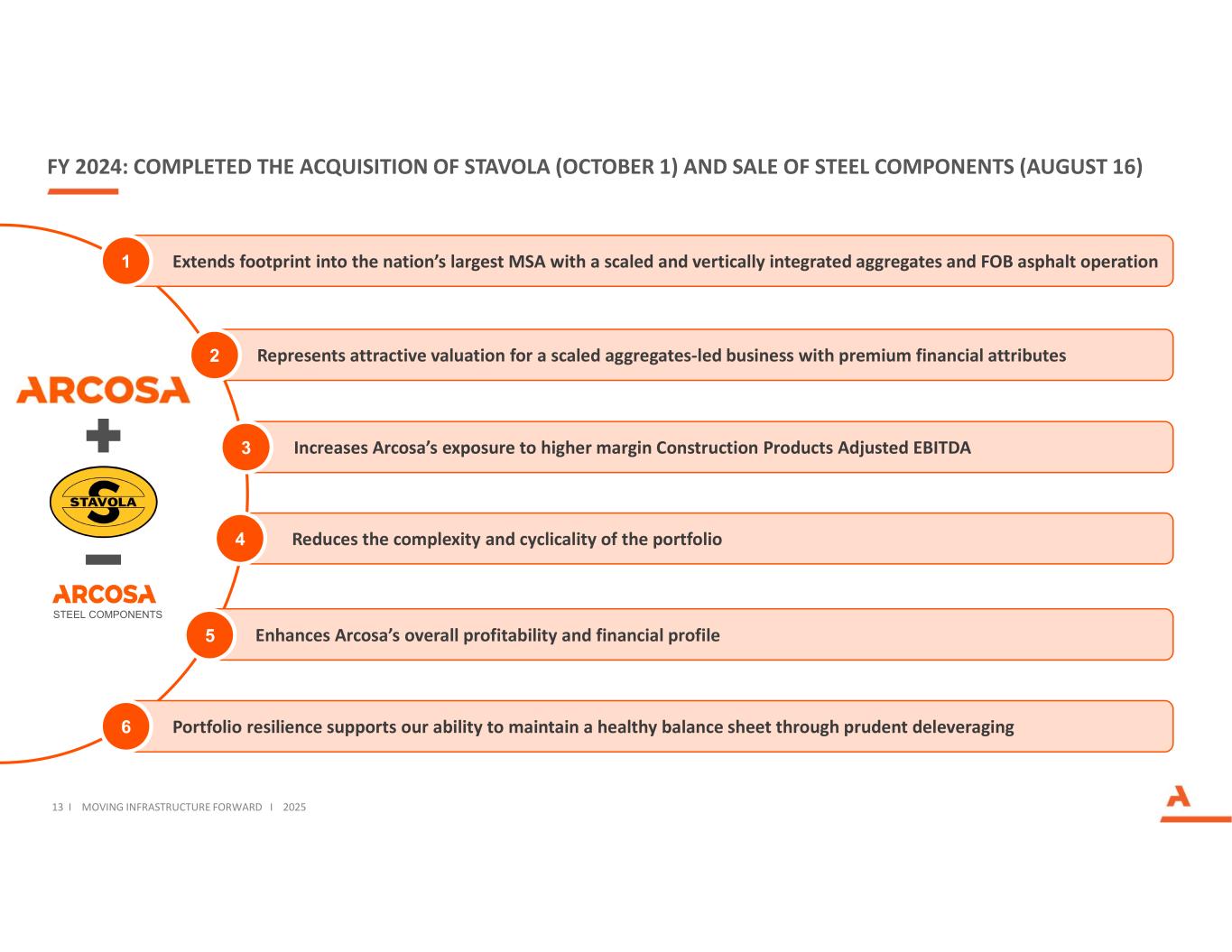 ~$2.7 billion of investment in Construction Products acquisitions as we seek to expand our growth platforms 12 I MOVING INFRASTRUCTURE FORWARD I 2025 ONGOING INVESTMENT IN OUR CONSTRUCTION PRODUCTS PLATFORM Q4 2024Q2 2022Q3 2021Q2 2021Q3 2020Q1 2020Q4 2018KEY ACQUISITIONS Natural Aggregates Recycled Aggregates FOB Asphalt Recycled AggregatesNatural AggregatesNatural AggregatesRecycled Aggregates Natural Aggregates Recycled Aggregates Natural Aggregates Specialty Materials Natural AggregatesPRODUCT LINE Expand exposure to northeast region Adding scaled and vertically aggregates and asphalt operations Entry into Southern California market Scaled entry into Phoenix Entry into attractive new geographies (TN, KY, and PA) Expanded presence in TX and along the Gulf Expanded presence in DFW Increased exposure to recycled aggregates Expanded presence in Houston Entry into recycled aggregates Added complementary scaled platform Diversified customer based and end-markets STRATEGIC FIT 5 active mines 3 recycled aggregates facilities 12 asphalt plants 4 crushing locations6 active mines14 active mines 5 crushing locations 1 active mines 12 locations 24 active mines 5 production facilitesLOCATION COUNT $1,200M$75M$150M$375M$87M$298M$315MPURCHASE PRICE 10.7X(1)7.8X10.7X12.9X(1)8.5X8.1X9.8XPURCHASE MULTIPLE Attractive fundamentals of Aggregates and Specialty Materials ● Attractive markets with long-term pricing and volume growth; less cyclical than other Arcosa businesses ● Sustainable competitive advantages, through reserve positions, permits, product portfolio, proprietary processing capabilities, and deep market knowledge ● Fragmented industry structure with ability to buy small to medium size assets at attractive multiples ● Ability to use acquisitions as growth platforms for future organic and bolt-on opportunities (1) Multiple shown net of estimated tax benefits
