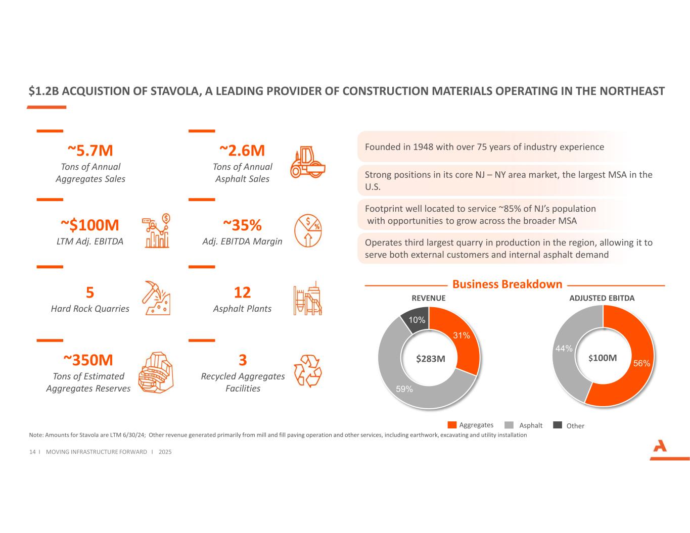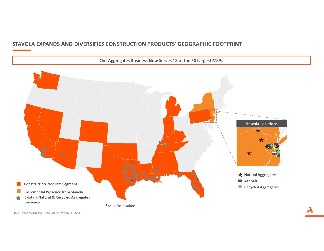 $1.2B ACQUISTION OF STAVOLA, A LEADING PROVIDER OF CONSTRUCTION MATERIALS OPERATING IN THE NORTHEAST BY THE NUMBERS COMPANY HIGHLIGHTS Operates third largest quarry in production in the region, allowing it to serve both external customers and internal asphalt demand Founded in 1948 with over 75 years of industry experience Footprint well located to service ~85% of NJ’s population with opportunities to grow across the broader MSA Strong positions in its core NJ – NY area market, the largest MSA in the U.S. Aggregates Asphalt Other ADJUSTED EBITDA 14 I MOVING INFRASTRUCTURE FORWARD I 2025 Business Breakdown 31% 59% 10% $283M ~$100M LTM Adj. EBITDA ~35% Adj. EBITDA Margin ~5.7M Tons of Annual Aggregates Sales ~2.6M Tons of Annual Asphalt Sales 5 Hard Rock Quarries 12 Asphalt Plants 3 Recycled Aggregates Facilities ~350M Tons of Estimated Aggregates Reserves Note: Amounts for Stavola are LTM 6/30/24; Other revenue generated primarily from mill and fill paving operation and other services, including earthwork, excavating and utility installation 56% 44% $100M REVENUE
