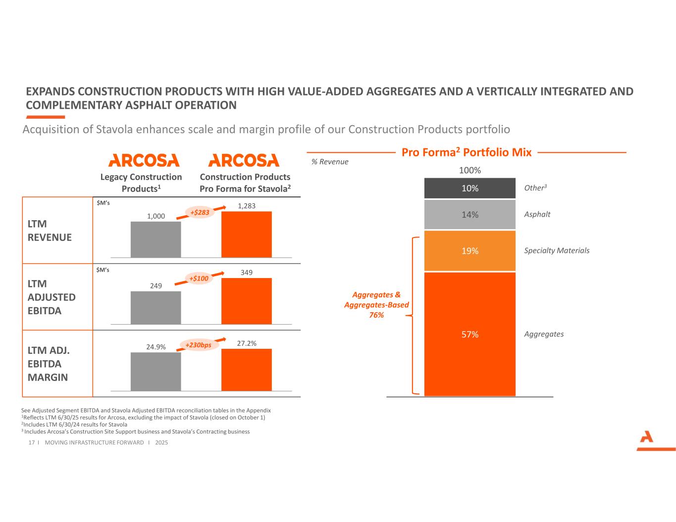 STAVOLA EXTENDS ARCOSA’S FOOTPRINT INTO THE NATION’S LARGEST MSA 16 I MOVING INFRASTRUCTURE FORWARD I 2025 Infrastructure 75–85% Residential 10–20% Non-residential 5–15% Aggregates Demand Asphalt Demand Infrastructure 80–90% Residential 5–10% Non-residential 5–10% Stavola’s Core Markets Are Over-Indexed to Infrastructure Demand 29M Tons ~80 – 90% of asphalt demand in Stavola’s core market is from maintenance projects, providing stability and low volatility 9M Tons Source: Third party research, USGS