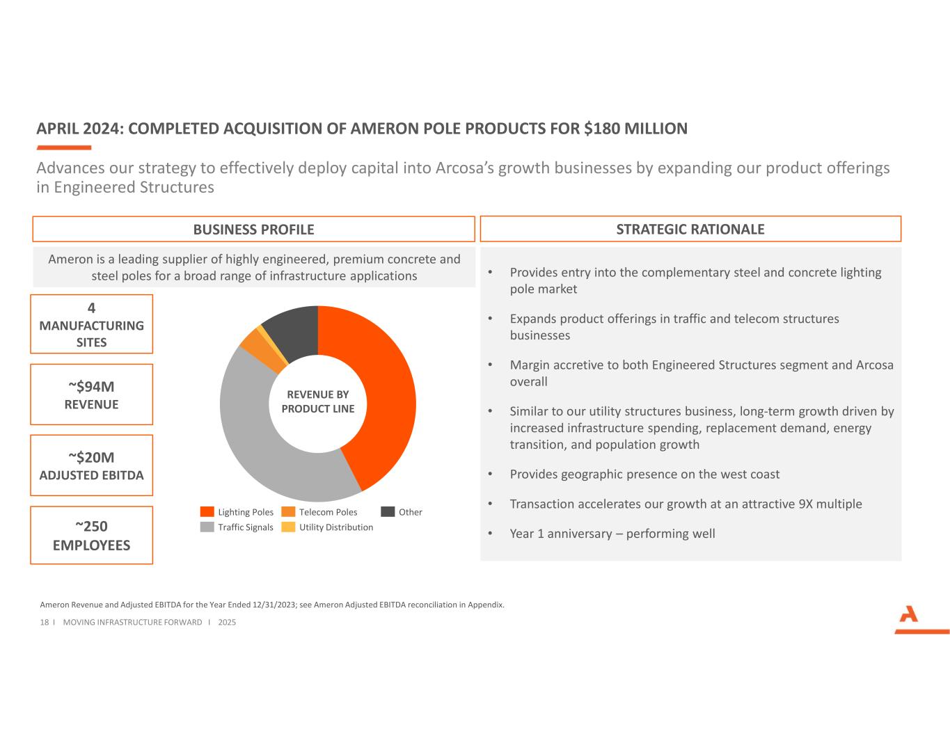 Construction Products Pro Forma for Stavola2 Legacy Construction Products1 LTM REVENUE LTM ADJUSTED EBITDA LTM ADJ. EBITDA MARGIN EXPANDS CONSTRUCTION PRODUCTS WITH HIGH VALUE-ADDED AGGREGATES AND A VERTICALLY INTEGRATED AND COMPLEMENTARY ASPHALT OPERATION Acquisition of Stavola enhances scale and margin profile of our Construction Products portfolio 17 I MOVING INFRASTRUCTURE FORWARD I 2025 Aggregates4 ~56% Asphalt ~14% Other2 ~12% % Revenue Pro Forma2 Portfolio Mix See Adjusted Segment EBITDA and Stavola Adjusted EBITDA reconciliation tables in the Appendix 1Reflects LTM 6/30/25 results for Arcosa, excluding the impact of Stavola (closed on October 1) 2Includes LTM 6/30/24 results for Stavola 3 Includes Arcosa’s Construction Site Support business and Stavola’s Contracting business 57% 19% 14% 0 Other3 Asphalt Specialty Materials Aggregates 100% Aggregates & Aggregates-Based 76% $M’s $M’s 1,000 1,283 249 349 24.9% 27.2% +$283 +$100 +230bps